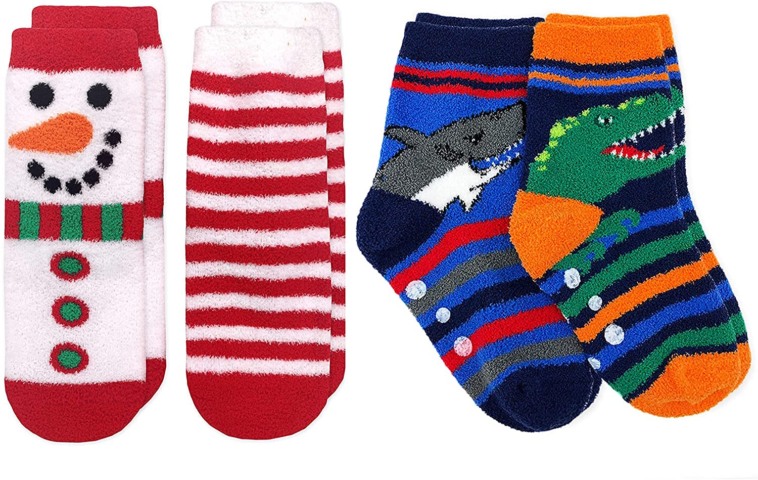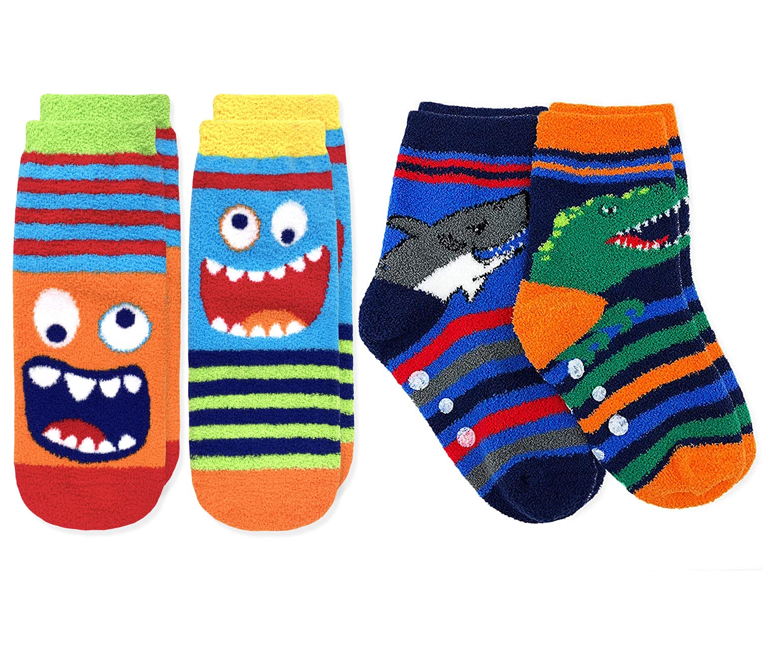 Ultra soft fuzzy fluffy yarn keeps little boys and toddlers feet warm and cozy Ultra soft fuzzy fluffy yarn keeps little boys and toddlers feet warm and cozy Colorful knit-in fashion novelty patterns include dinosaur, shark, multi color stripes, monster faces, and snowman, candy cane stripes Non-skid, no slip bottom grippers on the bottom of each sock prevent slipping Perfect for lounging and playing at home, gifts, Christmas, stocking stuffers, and more 4 pair pack value