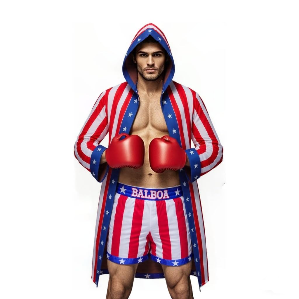 Adult Satin Mens American Flag Boxing Costume Balboa Boxer US Stars and Stripes Hooded Robe with Shorts