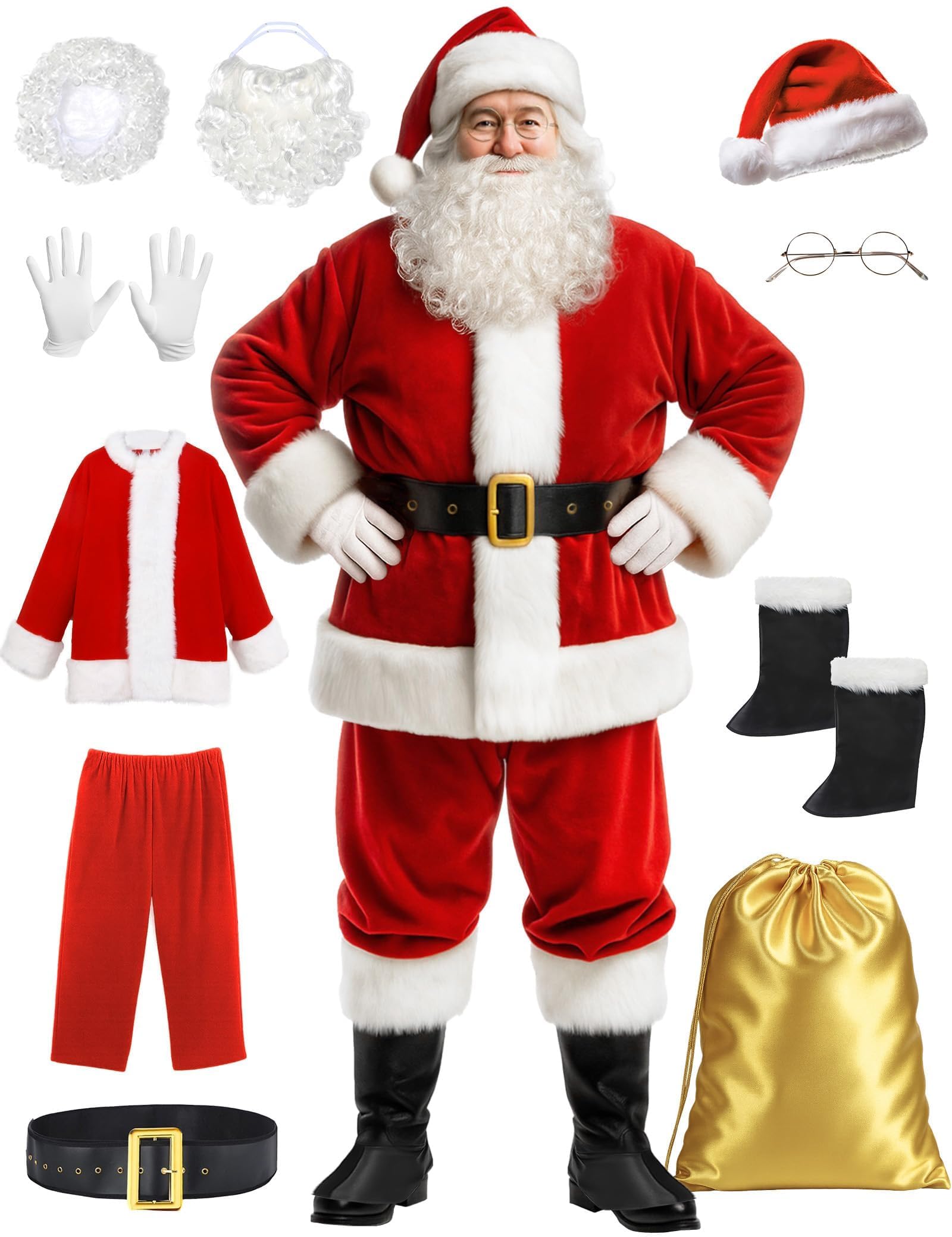 Santa Claus Costume for Men Santa Suit Adult 10PCS Plus Size Velvet Deluxe Santa Clause Christmas Outfit Holiday Party