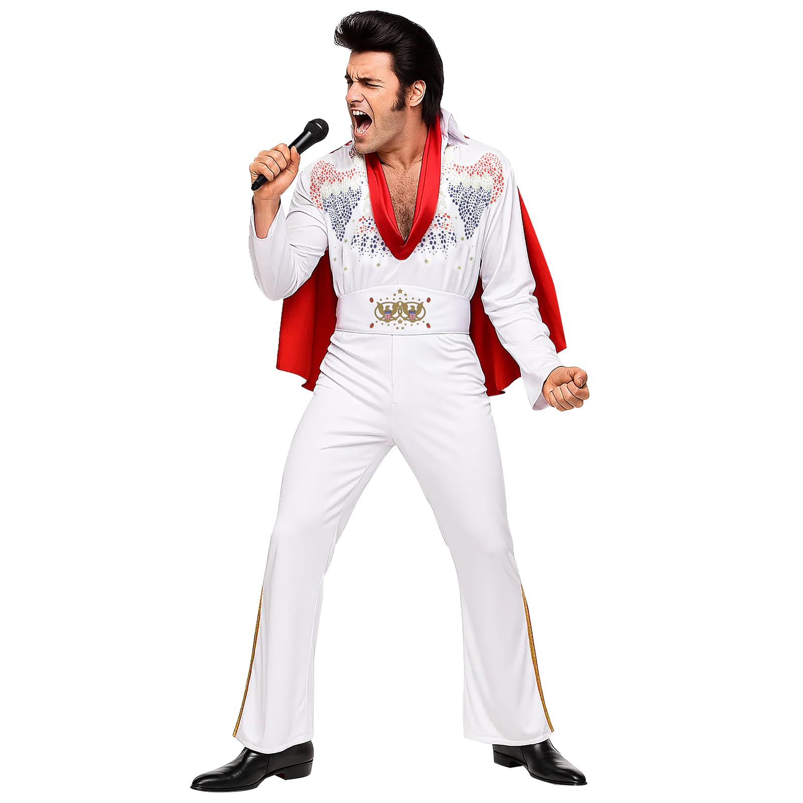 Made of high quality material, this rock n roll star costume jumpsuit outfit suit set is very comfortable to wear and gives you a fresh king look! This white rockstar costume includes a jumpsuit with cape, belt & scarf. Design: high quality prints and the cape is fully lined and printed on the back of the jumpsuit. This fashion rockstar costume jumpsuit uniform is perfect for 50s 60s 70s 80s or 90s rock theme party, rock star halloween costume men, rock n roll cosplay, rock singer costumes, masquerade, pretend play, rock concert, hip hop, disco, hippie, festivals, theater performance,stage performance, role play, fancy dress up, comic-con, birthday etc. This adult men boys rocker costume comes in 5 sizes Small, Medium, Large, X-Large, XX-Large. Please refer to the size chart in the below description for further detailed size information.