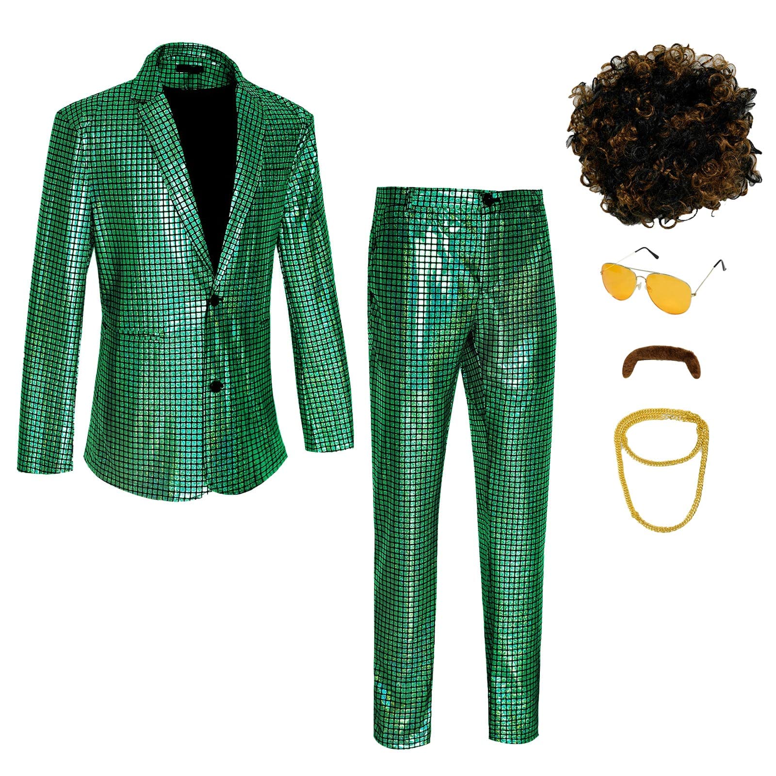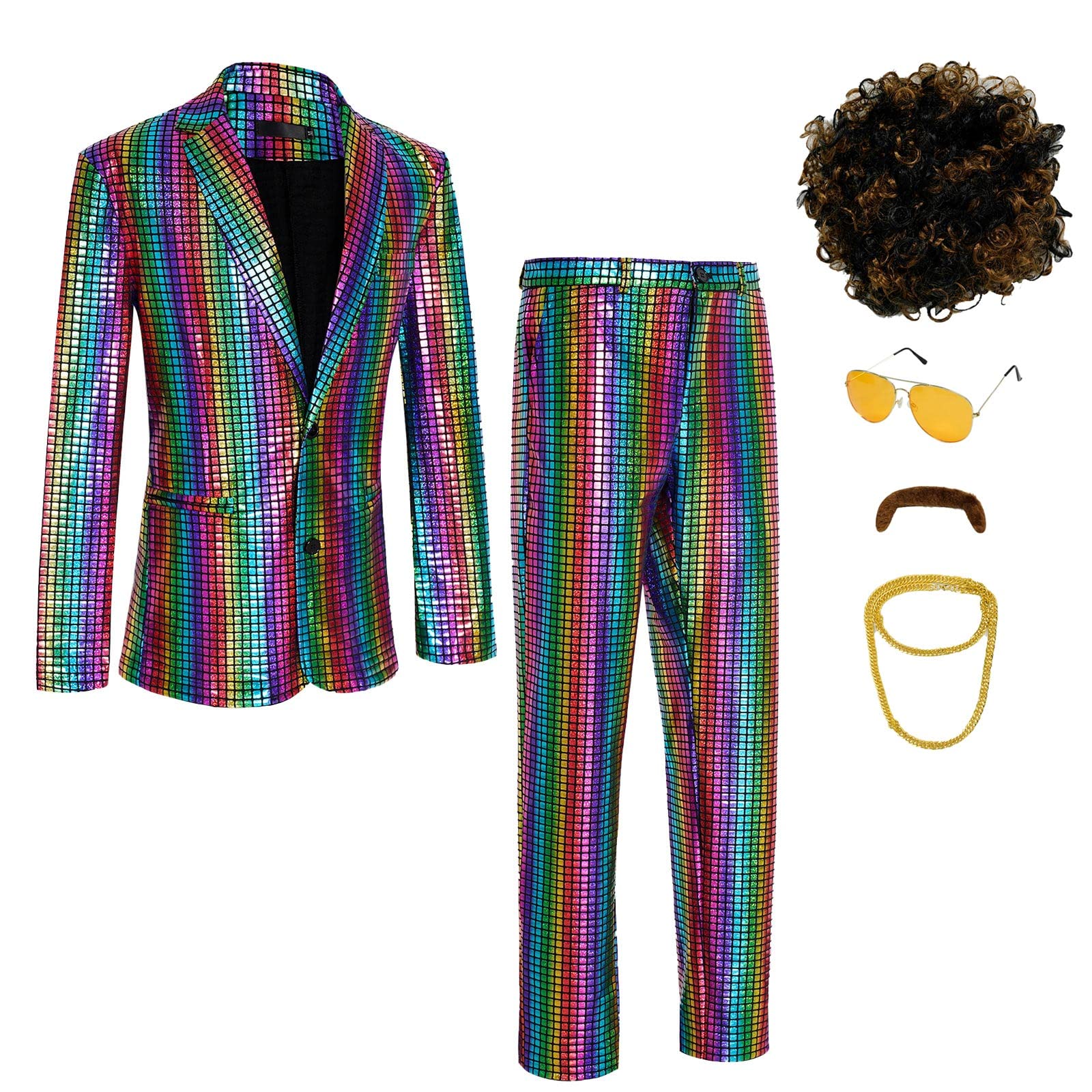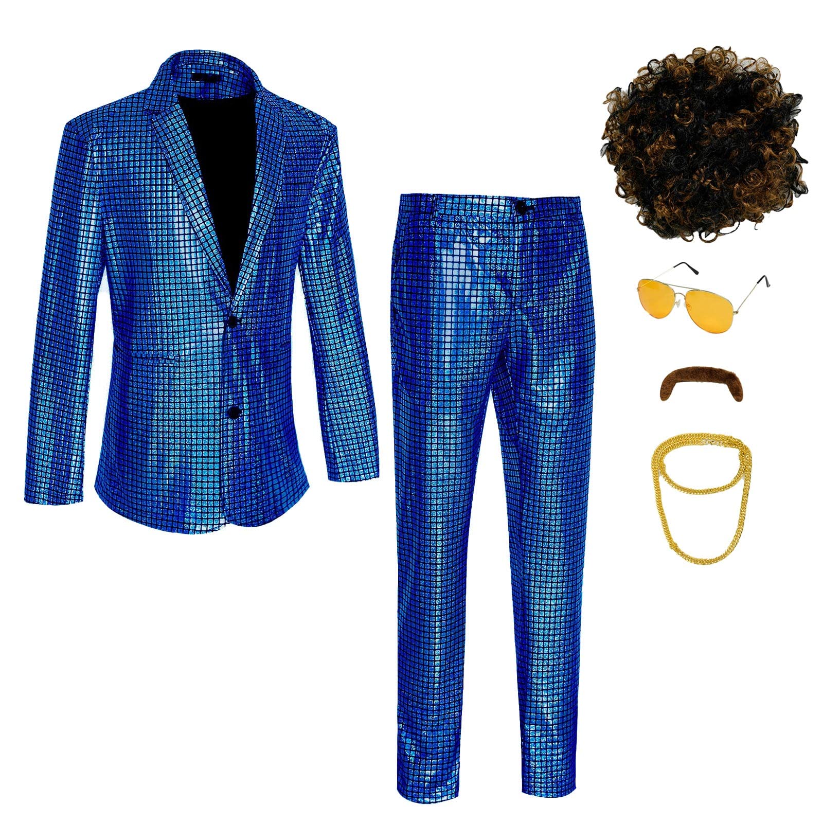 Including: A shiny sequin jacket and pants,afro wig X 1,gold necklace X 1,sunglass X 1,sticky beard X 1 Features: Disco Costume is designed in the 1970s style, with jackets and pants made of sparkling sequins, paired with various accessories. After wearing these clothing, you will become the center of attention for the crowd Suitable for various occasions, such as disco parties, 70s parties, 80s parties, cocktail parties, dances, costume parties, role-playing, Halloween themed costumes, Christmas parties, concert costumes, carnival costumes, holiday costumes; Graduation season performances, return to school days, etc PERFECT FOR DISCO PARTIES: Step onto the dance floor in our sleek disco suits. Designed to dazzle, it's the ultimate choice for Disco parties and a variety of year-round events like bachelor parties, festivals, and any Saturday Night Fever Nights where you aim to command the spotlight and groove the night away. SIZE AND GARMENT CARE - Please check SELLER'S SIZE CHART before purchasing;Please turn over the jacket when washing,DO NOT IRON.
