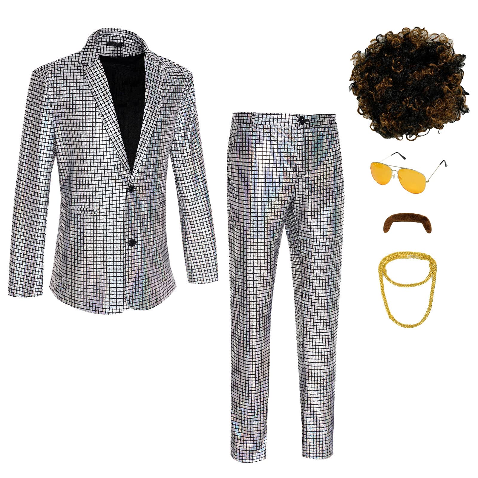 Men's 70s Disco Costume Shiny Metallic Sequin Suits Set Prom Party 2 Piece Outfits