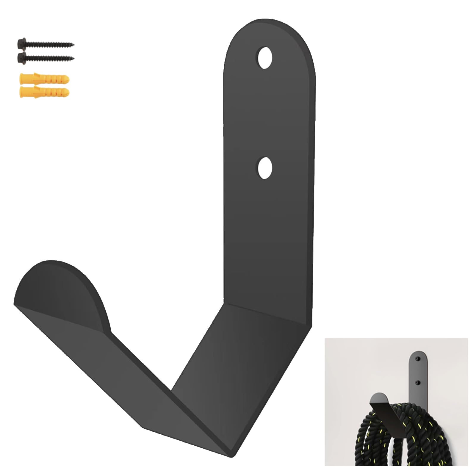 Space Saving: No more folding up your battle rope and throwing it in the corner of your gym floor. Exercise Rope Storage Rack can mount to any wall stud at any height. Always have a place for your fitness rope that will keep your rope from dirt and damage. Steel Battle Rope Storage Hook will ensure your rope lasts longer and your home gym cleaner Keep Organized: Multifunctional hook is mainly used to hang a variety of fitness equipment to avoid knots caused by stacking of ropes, such as: Battle Rope, Jump Rope, Lifting Belt, Exercise Rope, weight belts, immersion belts, chains, resistance bands, gym bags, etc.EV Charger Cable Holder keeps your EV charger cable organized and prevent the charging cable from getting tangled.Garden Hose Hanger for outside ​can store and hang your hose well Durability: Wall Mount Rope Hanger Organizer made of 3mm iron, which is not easy to bend or break,the surface is sprayed with a black matte coating to prevent weathering and rusting.This storage will hold up to 100lbs so all your ropes can be stored and can hold your EV charger firmly Easy Installation: Use the provided screws to secure the hook to the wall or wooden board, installation is very fast and simple.Battle rope holder suitable for homes, garages,garden and commercial gyms, it saves you storage space and keeps your battle rope in good condition Package Includes:Heavy Duty J-Hook for Exercise Rope x 2, screws x 4, rubber stopper x 4 and level gauge x 1. Size: 2.9 inches x7.5 inches x11.4 inches