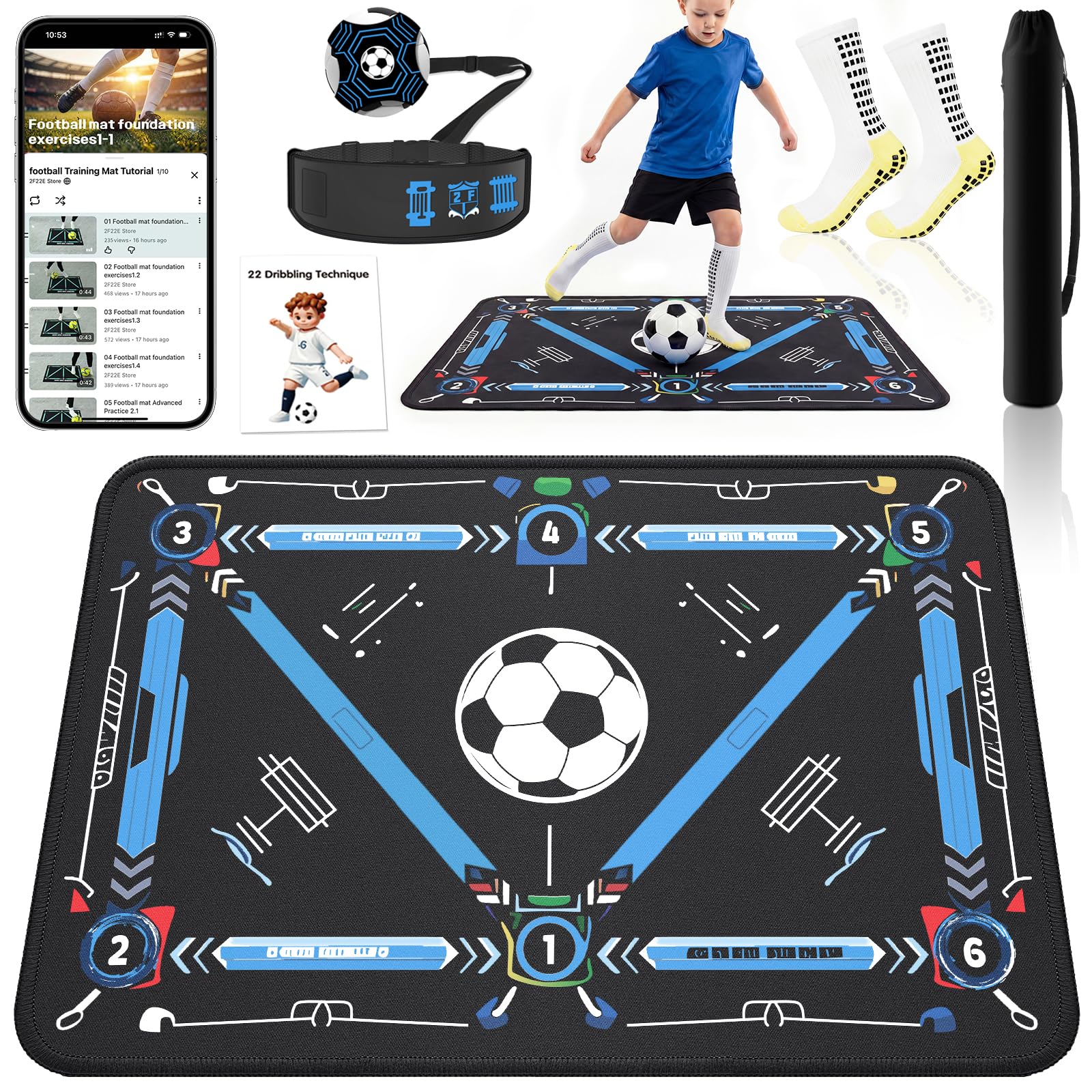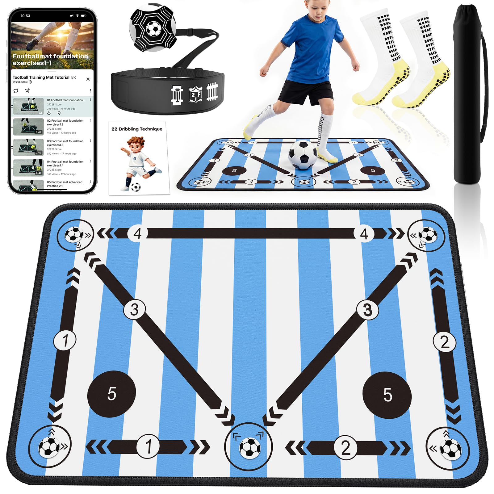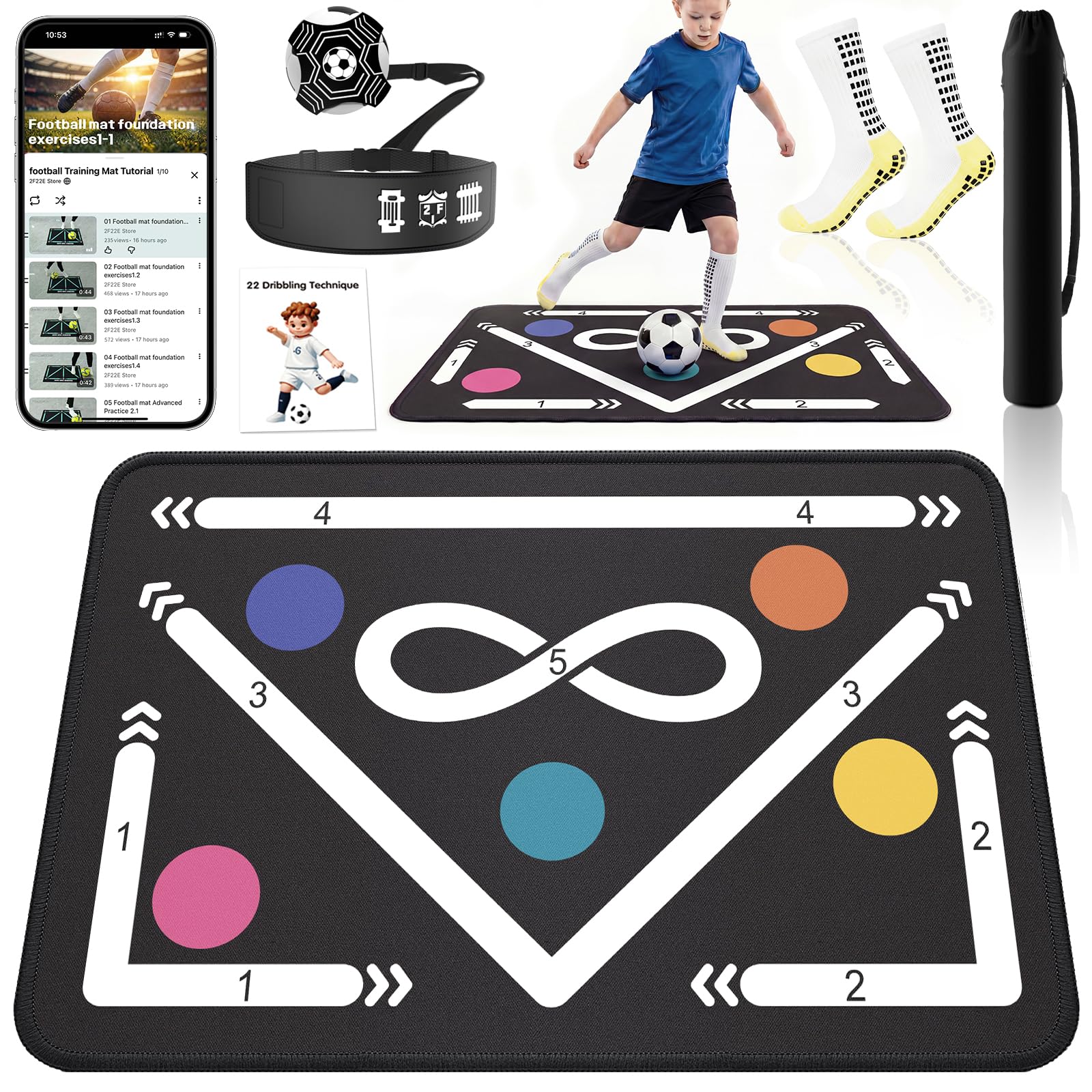 Soccer Training Mat for Kids & Youth, Non-Slip Silent Footwork Training Equipment with Soccer Bounce Trainer & Socks, Ball Mastery Skills Mat with Instructional Video for Indoor Practice