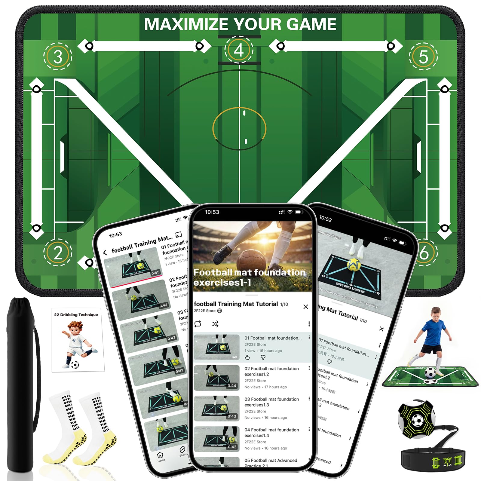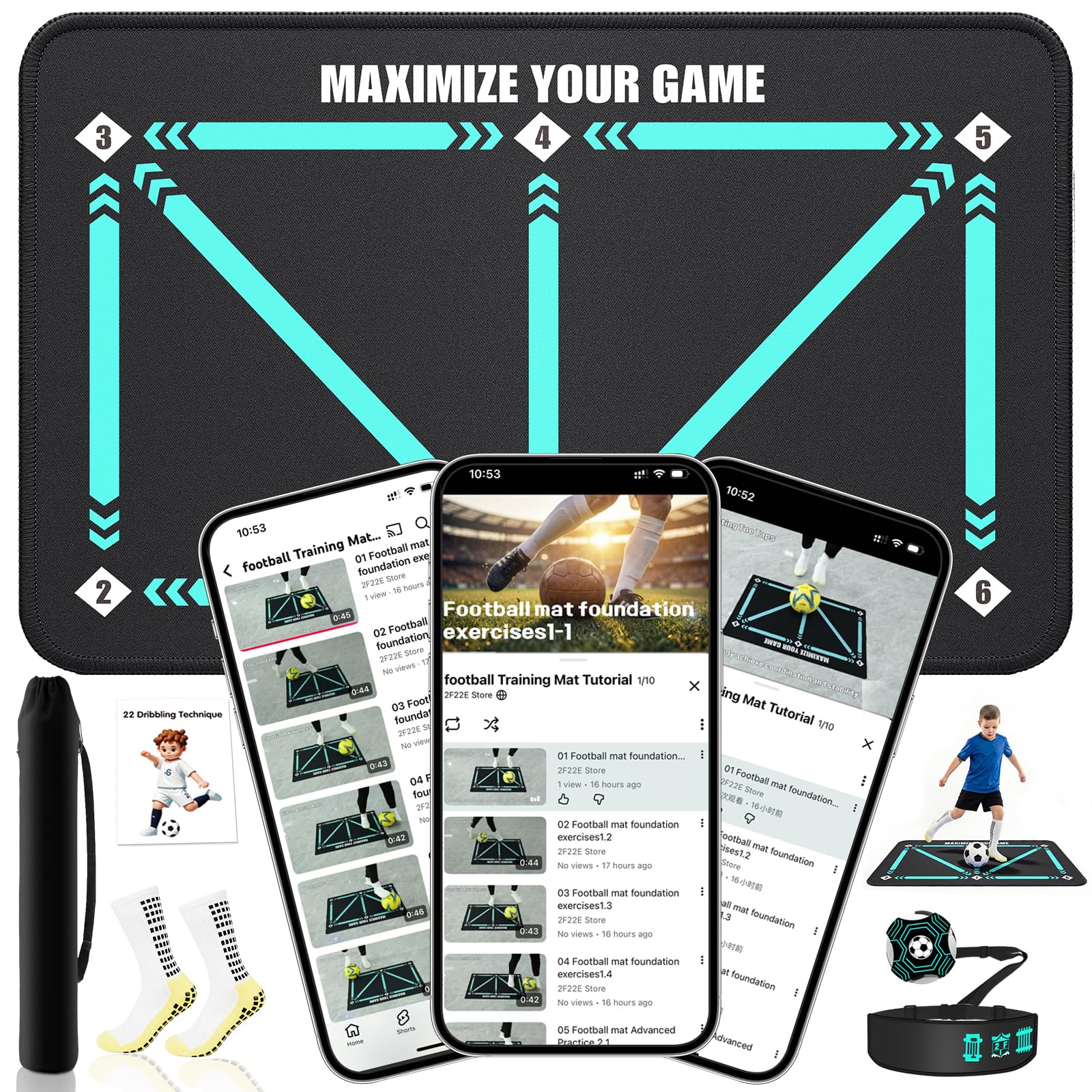 Includes a 35.4" x 23.6" soccer training mat, grip socks, and a soccer bounce trainer for solo practice. Designed as a complete soccer training equipment set, it also comes with step-by-step video guidance and instructions to help kids and beginners build skills effectively at home or outdoors. This soccer training mat is designed to enhance footwork, ball control, agility, and coordination. The printed drill patterns guide players through essential movements like lateral control, push-pull, and quick direction changes, helping develop confidence and consistency on the field. Built with a non-slip base and shock-absorbing layers, this soccer practice equipment stays stable during intense drills. The silent training surface reduces noise, making it ideal for indoor use without disturbing others. Lightweight and easy to roll up, this soccer training equipment is perfect for use at home, backyard, gym, or field. Whether practicing daily drills or improving ball mastery, players can train anytime regardless of weather conditions. Specially designed for kids, youth, and beginner players, this soccer training mat helps build fundamental skills in a fun and structured way. It also makes a practical gift for young soccer enthusiasts who want to improve their game.