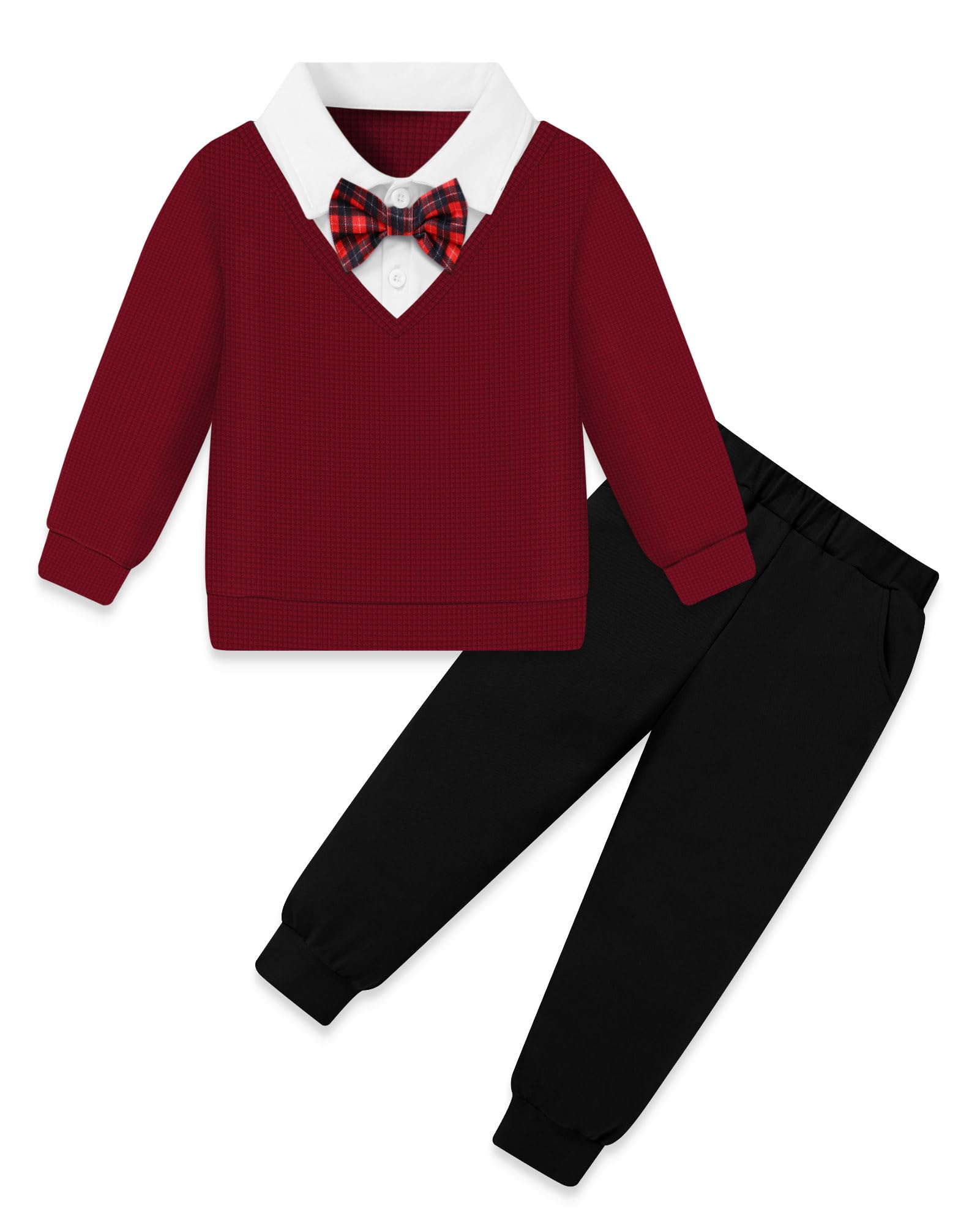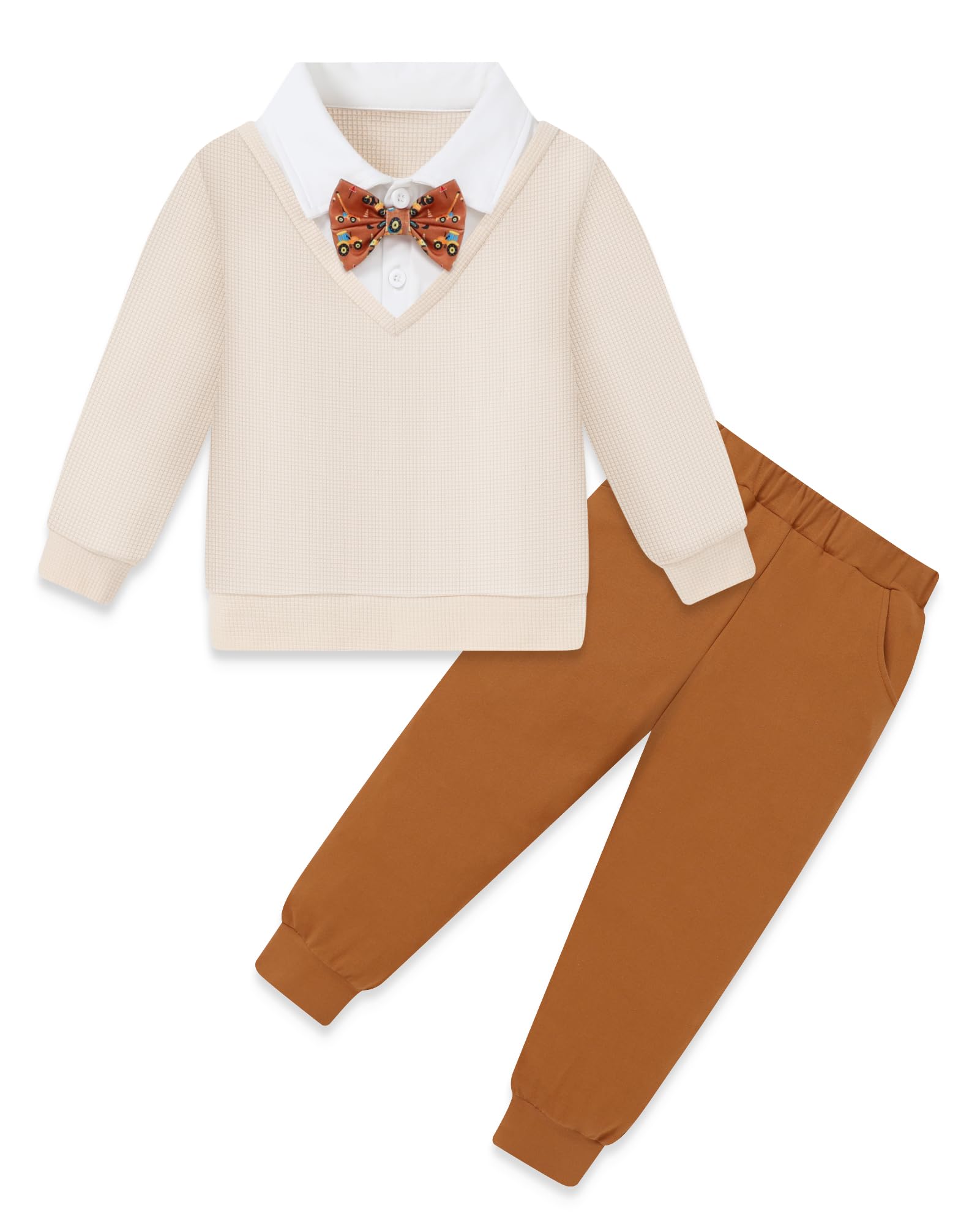 Material: Boy clothes made of polyester&cotton blend—knitted fabric that is breathable, lightweight, soft and comfortable to wear. Our high-quality toddler clothes will bringing your boys a good wearing experience and they will love it. Design: Toddler boys spring fall winter outfit sets, fake two piece polo neck pullover sweatshirt with bowtie, casual long pants with pockets. The fake two - piece design blends sweatshirt and shirt elements, offering both casual comfort and a touch of formality, making it stylishly unique.your baby will receive more praise. Occasions: The boy clothes pants set is suitable for casual daily wear, family gathering, memorable photography shoots, Christmas baby gifts, Thanksgiving presents, celebration, coming home outfit, and so on. Also great show gifts to your lovely sons/grandson/nephew/little brother Size: Boys Clothes have 5 sizes, toddler boy fall clothes 2-3t, toddler boy clothes 3-4t, fall winter outfit for boy 4-5t, boy pullover sweatshirt 5-6 years, boys clothes 6-7 years. Package Included: 1pc Boy long sleeve top + 1pc pants + 1pc bow-tie , Machine wash cold, hang to dry, do not bleach. Each set of boy clothing is carefully selected, elying on color matching to reflect fashionable beauty.