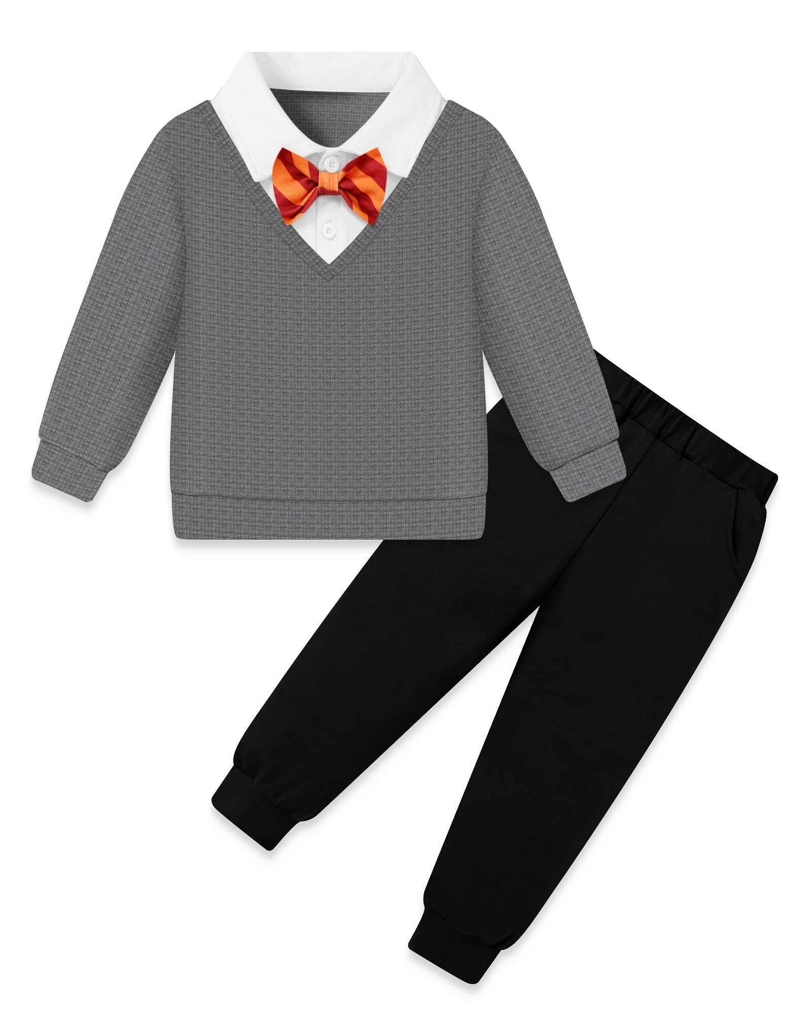 YALLET Toddler Boy Clothes Faux Two-Piece Polo Sweatshirt Fall Winter Pullover Top+Bowtie+Pants Outfit Set for Kids 2-7 Years