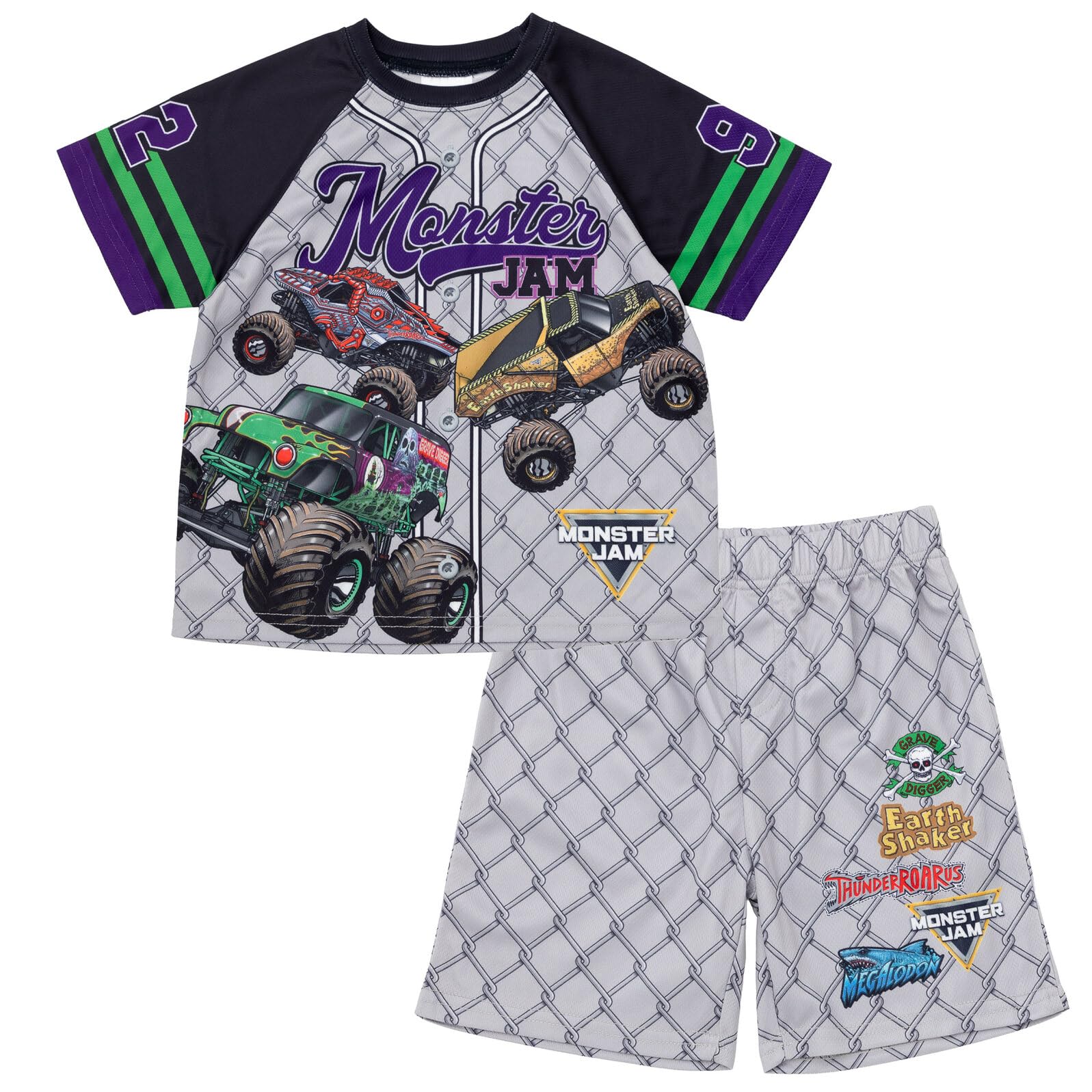 Monster Jam Athletic Mesh Baseball Jersey T-Shirt and Shorts Outfit Set Toddler to Big Kid Grave Digger Megalodon Digatron