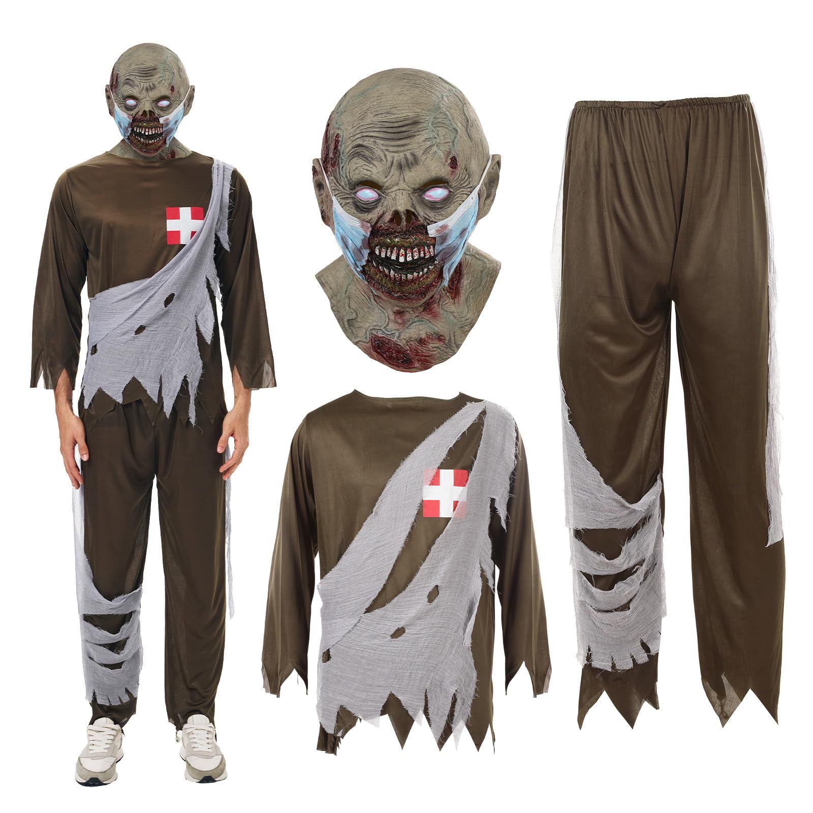 【Design】Scary halloween costumes for adult has a terrifying zombie style, full of horror and mystery, which can create a strong Halloween atmosphere. 【Zombie Costume】Composed of a tattered top, torn pants, and a lifelike zombie mask. The clothing is designed with ragged edges and simulated bandage decorations, and the mask has realistic rotten skin and fierce eyes, highly restoring the image of a zombie. 【Material】Scary costumes made of lightweight and breathable fabric, it is comfortable to wear and won't cause a sense of restraint, suitable for long - time dressing up. 【Size】Halloween costumes available in multiple sizes to meet the needs of different - sized adults. Please check the size chart carefully before purchasing. 【Occasions】Ideal for Halloween parties, horror theme parties, cosplay events, or other occasions where a scary zombie look is desired.