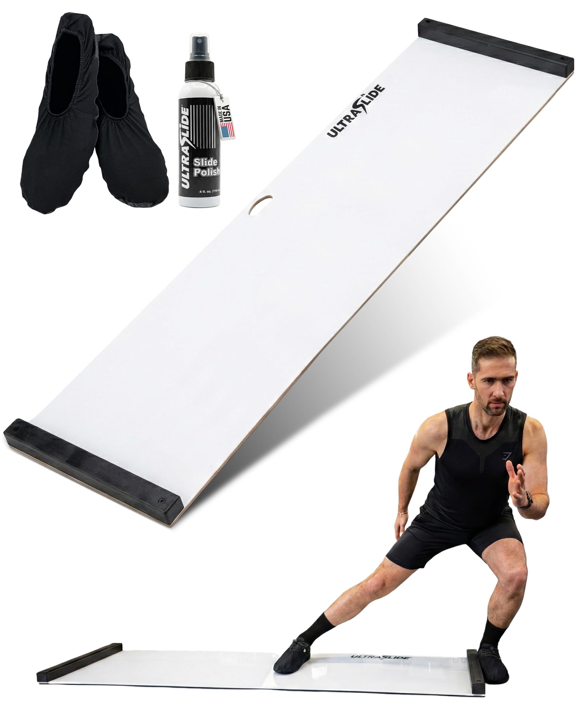 Smooth Mobility Surface: Built for fluid lateral movement, this board supports controlled stretching, warm-ups, and cool-downs. The solid 0.125" polymer surface enhances every sliding board exercise with consistent glide and uninterrupted transitions, engineered to stay flat for life. Stable Grip Foundation: Engineered to stay firmly in place on hardwood, turf, tile, or rubber flooring. Unlike basic slide boards for exercise, this skating slide board delivers reliable stability during dynamic drills. Focused Power Training: At 60” long × 19.5” wide, this board is designed for targeted lateral drills without requiring a large training space. Designed for slide board hockey training, it helps develop balance, coordination, and effective off-ice conditioning. Versatile Performance Design: This exercise slide board adapts easily to strength, mobility, and core routines. Use it as a pilates slider board, skating trainer, or for sport-specific drills that engage multiple muscle groups through controlled, low-impact movement. Its smooth surface allows beginners to start with basic stretches and progress confidently to more advanced routines. Pro-Level Build. Anywhere You Train: Handmade in the USA and crafted for daily use in homes, clinics, and training facilities with an easy-clean surface. It stores upright in a closet or slides flat under most standard beds. Includes a pair of Regular Slide Slippers for immediate setup and space-smart storage.
