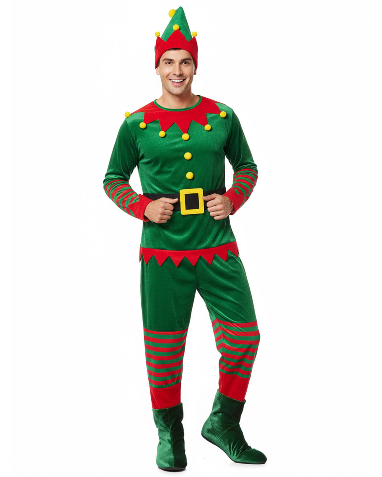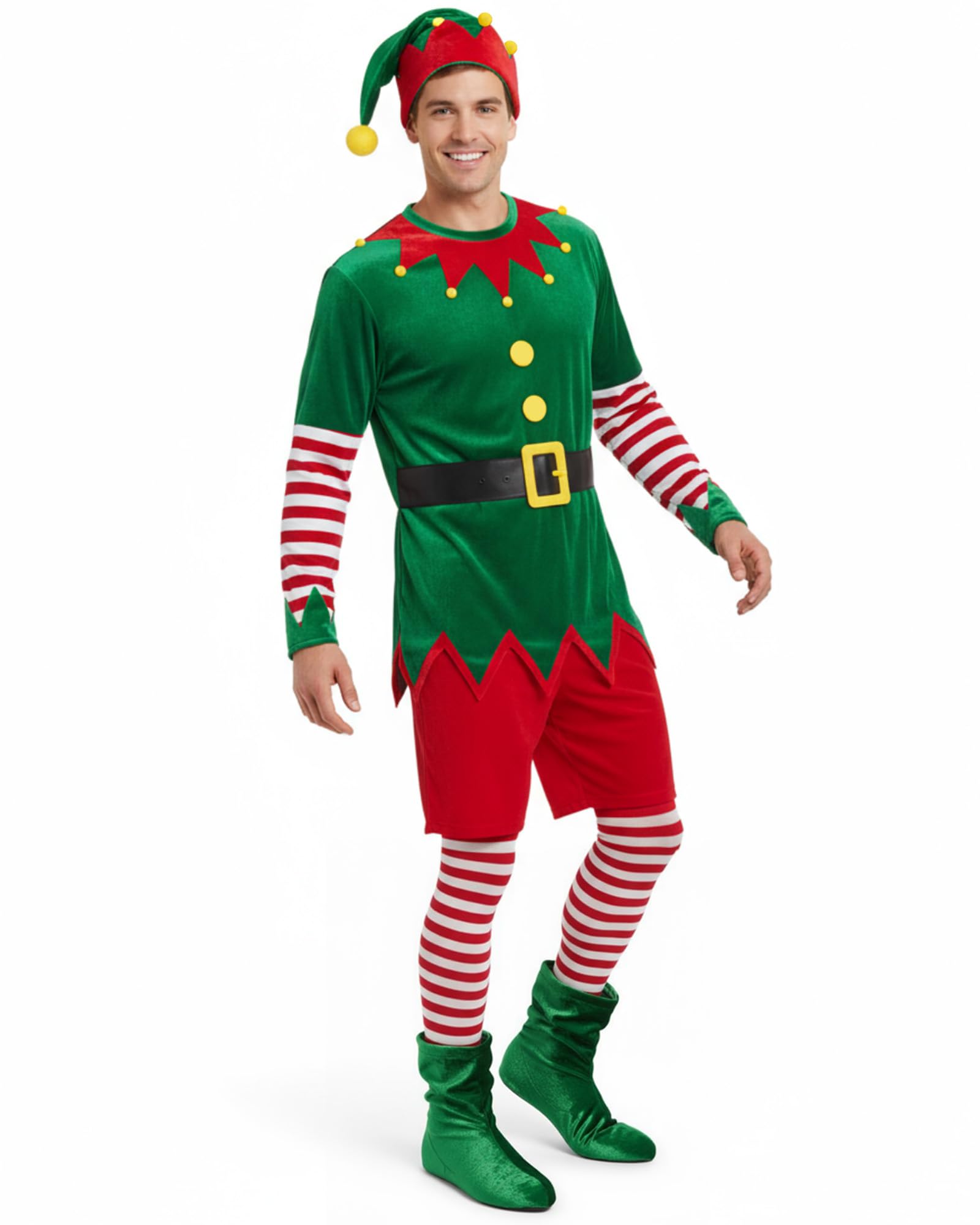 Complete Elf Costume Set: This men's elf costume includes 1 elf hat, 1 long-sleeve top, 1 pair of pants, 1 pair of striped socks, 1 pair of elf boot covers, and 1 belt. One set instantly creates a festive look, transforming you into a cheerful green elf ready to spread holiday joy anytime Eye-Catching Holiday Design: Featuring classic elf details, jagged collar edges, a pointed hat with pompom, striped socks and sleeves, and curled-toe boot covers, this men's Christmas elf cosplay outfit makes you stand out while enjoying the festive spirit Soft Velvet Fabric: Crafted from quality red and green velvet fabric, this adult elf costume is warm, breathable, soft, and stretchy. Whether you're dancing, playing games, or acting as Santa's helper, you'll stay comfortable and move with ease whole day Multiple Size Options: Available in various sizes for a great fit, this men's elf cosplay suit ensures comfort for different body types. Please check the size chart in the product images before purchase. The adjustable belt allows you to customize the fit for added comfort Versatile Holiday Use: Add extra fun to your Christmas with this men's Santa helper costume, ideal for office holiday events, festive parades, family gatherings, cosplay, costume parties, or holiday photo shoots. It's the perfect choice for any elf-themed celebration