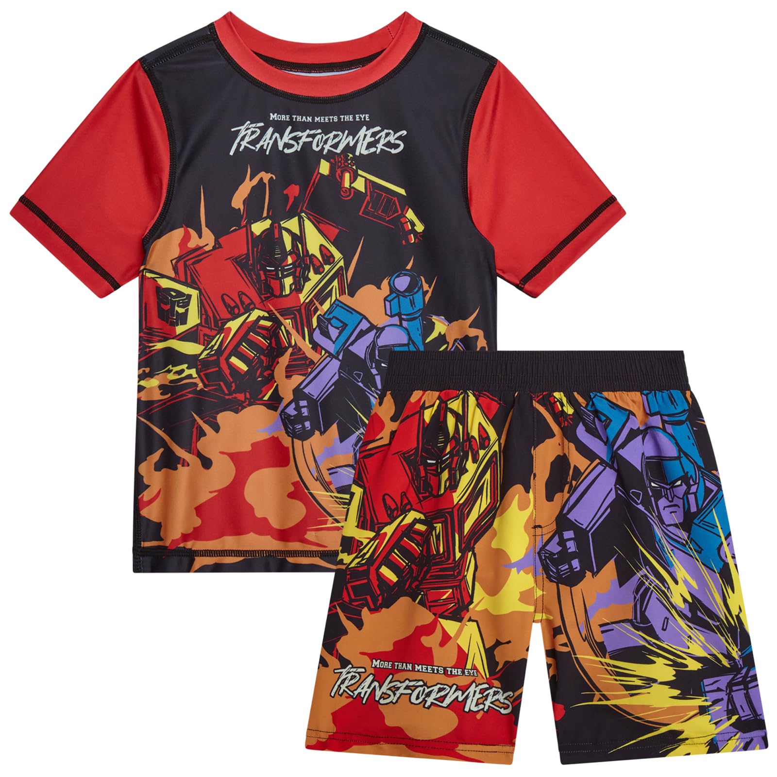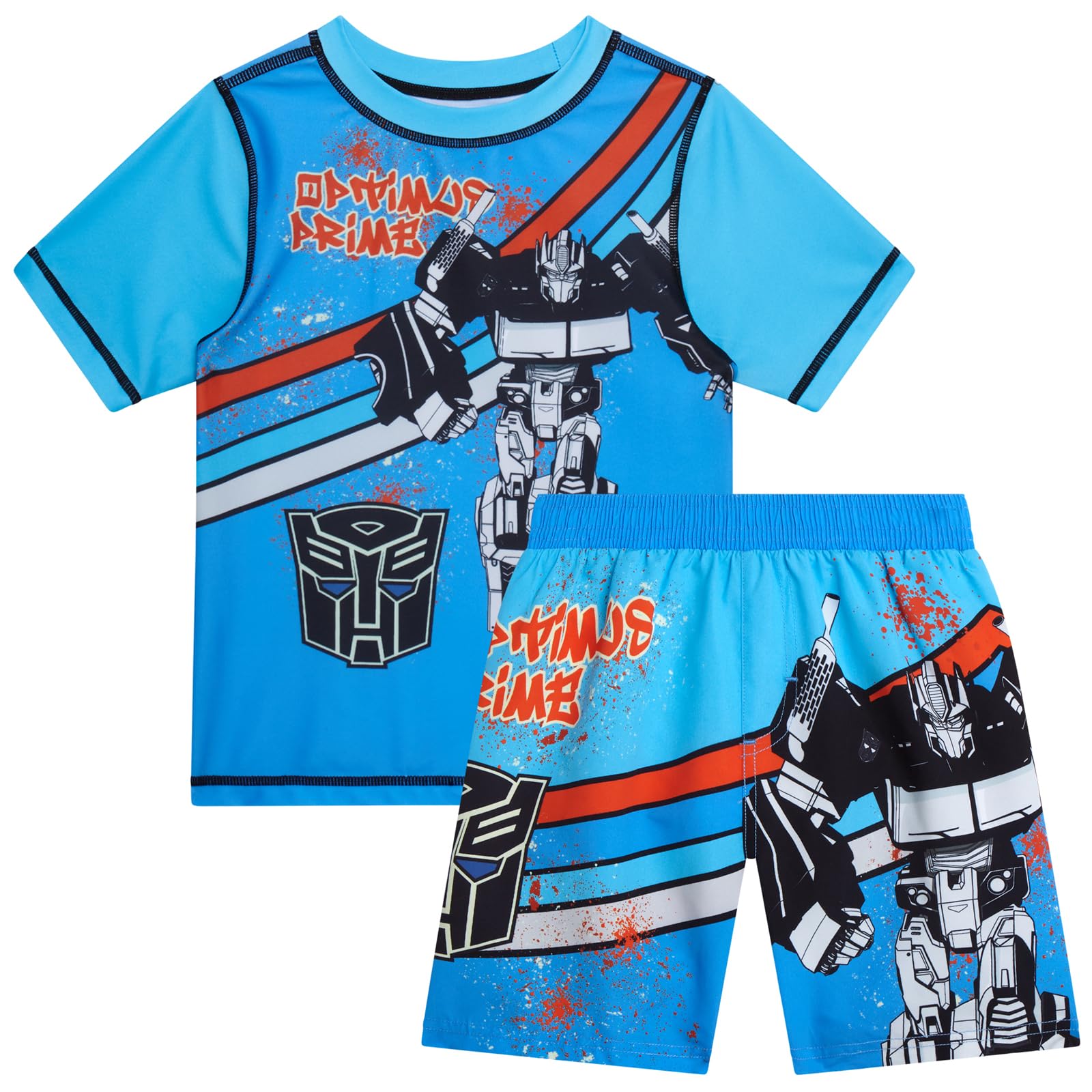 Officially Licensed TRANSFORMERS Optimus Prime: Bring action to the beach with this boys swim trunks boys swimsuit featuring Optimus Prime in comic-style art. The 2-piece boys swim shirt and swim trunks boys set is made for water adventures. A must for young fans who love swimming trunks for boys with character power. Boys Swim Set Comfortable Summer: Designed for movement and play, this Optimus Prime kids rash guard and boys swim shorts combo offers stretch, comfort, and coverage in and out of the water. The boys rash guard short sleeve top provides mobility and sun-safe coverage, while the matching swim shorts for boys keep them cool and confident for pool days, beach games, or backyard fun. Rash Guard For Boys Action-Ready: Built for active kids, this boys' swimwear set features quick-dry, lightweight fabric that keeps up with every cannonball and wave chase. The Optimus Prime boys bathing suit set delivers breathable comfort and durability-perfect for hours of fun in the sun. Whether it's for toddler swimsuit boy playdates or boys swimming trunks adventures, they'll stay cool and comfortable all day. Kids Swimsuits For Mini Heroes: The elastic waistband and adjustable tie on these boys swim shorts offer a comfy, secure fit for easy wear. The matching swim shirts for boys protect from sun and sand while allowing free movement. Great for 3t swimsuit boys to 4t swimsuit boys, these Optimus Prime kids swim suits boys are ready for pool parties, family vacations, or any swim wear adventure. Boys Rash Guard For Every Splash: From beach days to poolside battles, this boys swimsuit set blends comfort and character power. The boys rash guard short sleeve top and Optimus Prime swim trunks boys bottoms make a vibrant swim suit for boys option that dries quickly and resists wear. Kids will love the bold design while parents love the easy care-Transformers style meets summer fun for every toddler swimsuit.