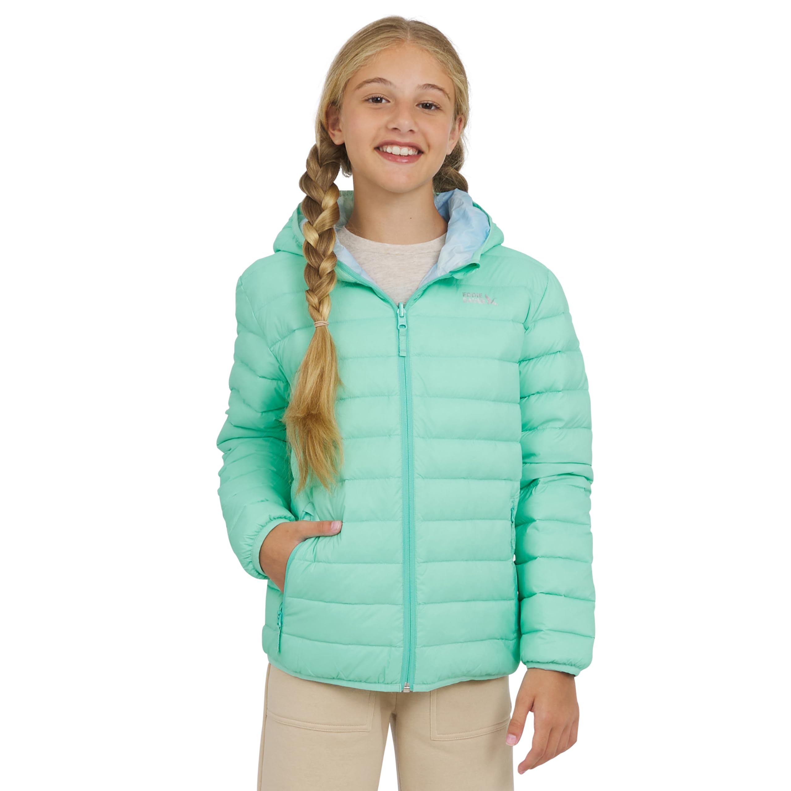 EDDIE BAUER LIFESTYLE: A legacy of adventure-driven innovation, Eddie Bauer is committed to a more sustainable and inclusive future. The brand uses materials and methods that minimize environmental impact, building an outdoor culture that is open and welcoming to everyone. VERSATILE & STYLISH: The ultimate jacket for girls! Our reversible design instantly transforms their look for any adventure, making it a perfect go-to for the colder seasons. It effortlessly pairs with everything—from jeans and leggings to ski pants and hoodies. Complete with a signature reflective Eddie Bauer logo for a touch of iconic style and added visibility. PREMIUM COMFORT & COZY WARMTH: Unleash their inner adventurer with a jacket so light, they'll forget it's there. Our ultra-cozy 650-fill down blend delivers a cloud-like warmth that feels incredible, so they can stay active and comfortable on the coldest days. BUILT FOR THE ELEMENTS: Ready for anything the weather throws their way! The powerful water-repellent finish causes rain to bead right off, while the fixed hood and clever draft-blocking binding work together to create a fortress of warmth that seals out the chill. SMART DESIGN & QUALITY CONSTRUCTION: Designed for real-life adventures, this jacket is built to last. Our special down-proof coating guarantees feathers stay exactly where they should be, while secure zippered pockets keep treasures safe. And because it's machine washable, life's messes are no match for this jacket.
