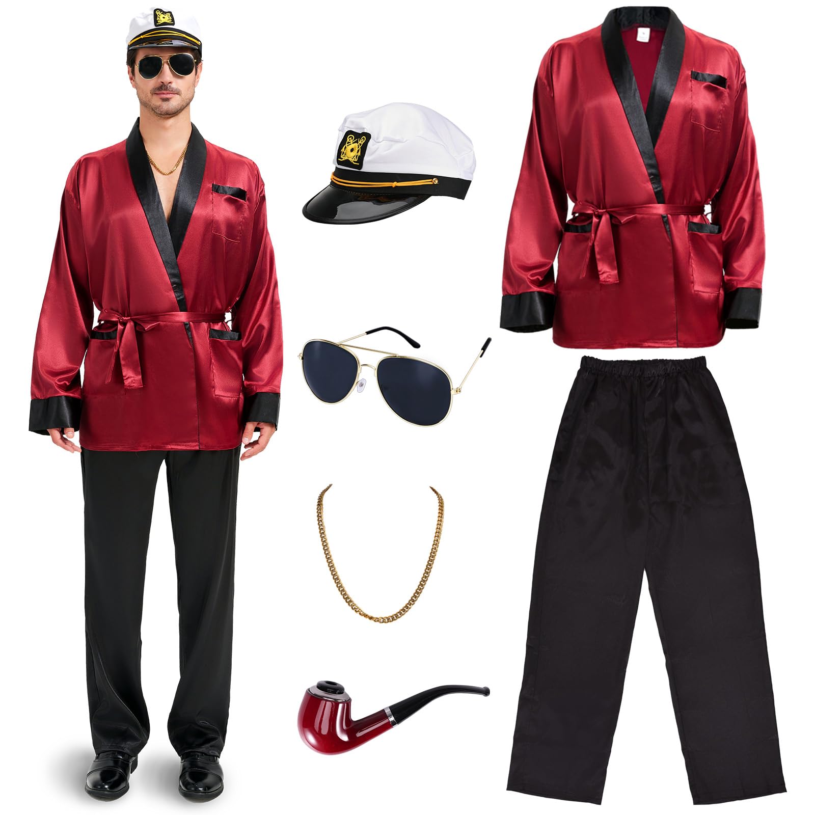 Halloween Red Silky Robe Jacket Costume Set Men's Captain Outfit with Hat Sunglasses Chain Funny Adult Party Cosplay