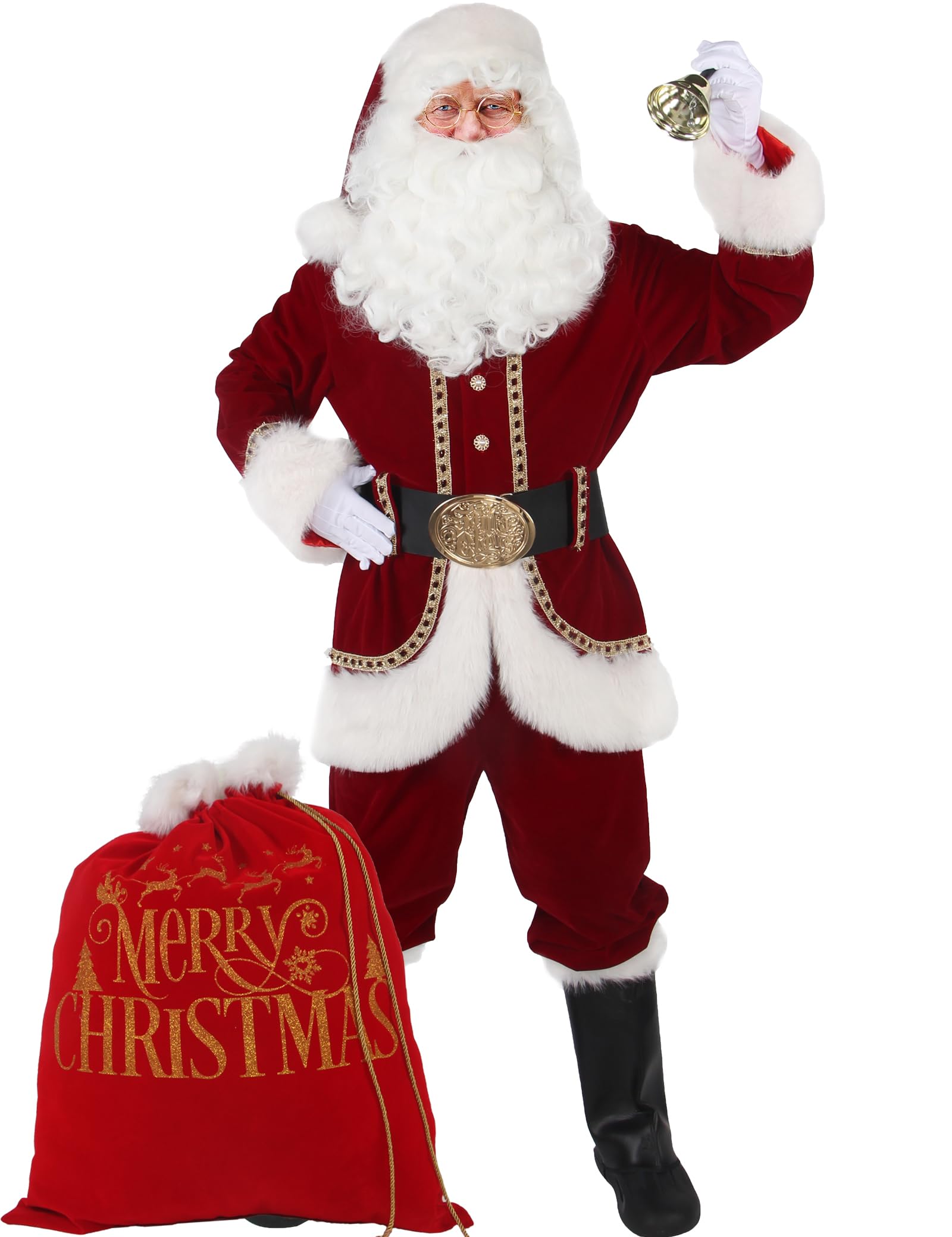 Professional Santa Claus Costume: Our Santa Suit for men is adopted with high quality flocking cloth and white plush edges, comfortable to wear, soft to touch, lightweight and durable, you can wear it for times and enjoy every Christmas. Don't hesitate! Put on this deluxe Santa suit for adults, and get ready to help make children's dreams come true while creating cherished memories. 11 PCS Santa Suit Set: The Christmas Santa Claus Costume for Men includes Red flocking button jacket, Elastic waist pants with pocket, Black belt with gold embossed pattern oval buckle, Santa hat with has fur edge band & pompom at tip, White wig, White beard, Gloves, Glasses, Black faux leather boot covers, Red gift bag comes with a gold braided drawstring and printed merry Christmas, Big bell. Deluxe Santa Outfit Features: Our Christmas jacket is adorned with opulent golden brocade ribbon edging at the center front, hemline, cuffs, hat's brim, and belt loop which make the Santa suit look exquisite and luxurious. White faux plush fur trim along the sleeves, hemline, keeps you warm in the cold winter. Especially the unique black belt with an exquisite gold embossed oval buckle, more eye-catching. Perfect for Many Occasions: Christmas celebration, Christmas Eve, Carnival, Parade, New Year, Halloween, Street, Birthday, Family Gathering, Thanksgiving Day, Fancy Dress, Wedding, School event, Stage Show and other activities. Wearing this santa costume and taking photos with your family will make your photos super amazing and bring smiles to the faces of all the kids around you. Multiple Sizes: Santa Claus costume plus size come in sizes Small to 3X-Large, to make the costume more suitable for you, please refer to our specific size information. Please allow little color difference due to different camera or light environment. Clean Tip: Dry clean or hand wash separately from other colors of clothing.