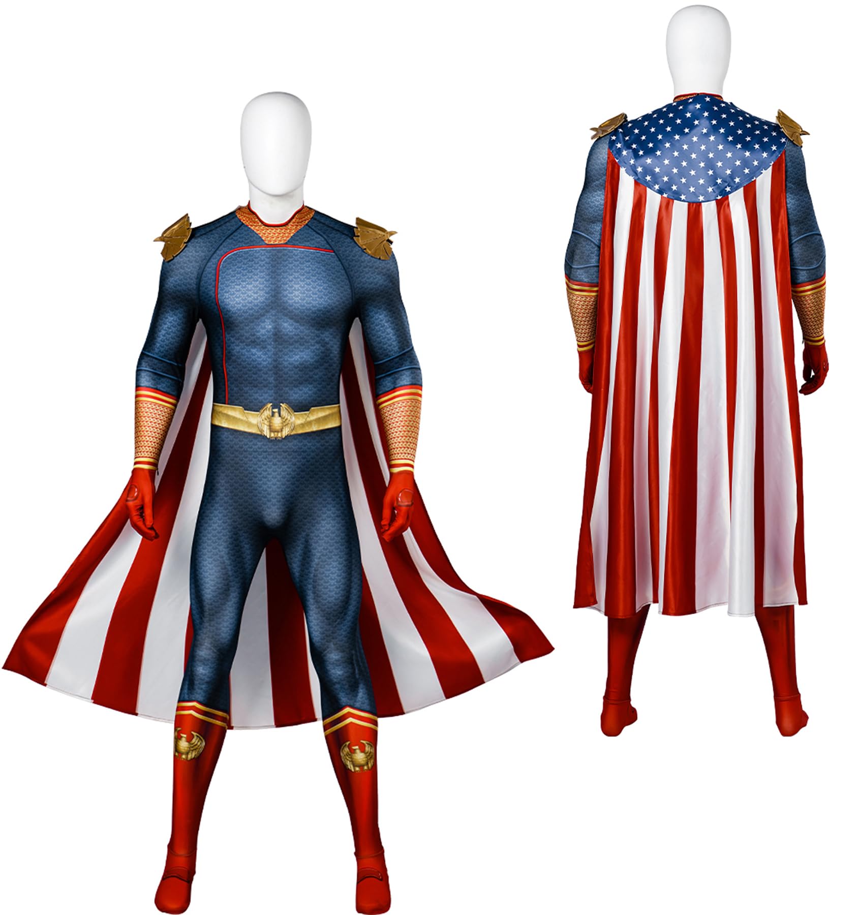 Homelander Costume Adult Men Homelander Cosplay Bodysuit with Cloak Outfit for Halloween. Material: Homelander Costume is made of polyester fabric + Satin fabric. Including: Jumpsuit + Homelander Cape + Armor. Occasion: homelander suit is Perfect for cosplay, Halloween party, on the stage , Christmas, daily wear, theme party , birthday ect. Size: Standard US Men Size. Please refer to Amazon Size Chart.