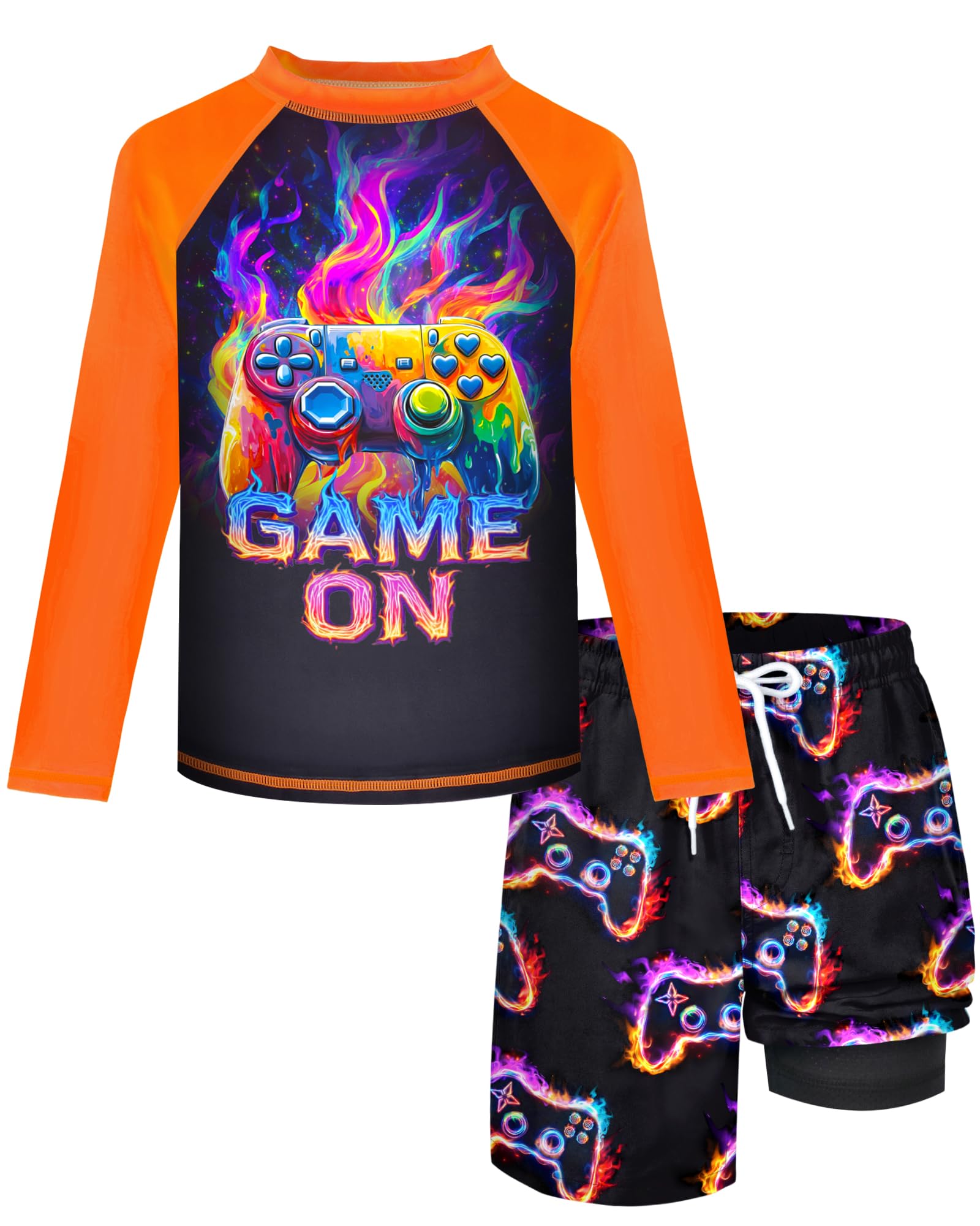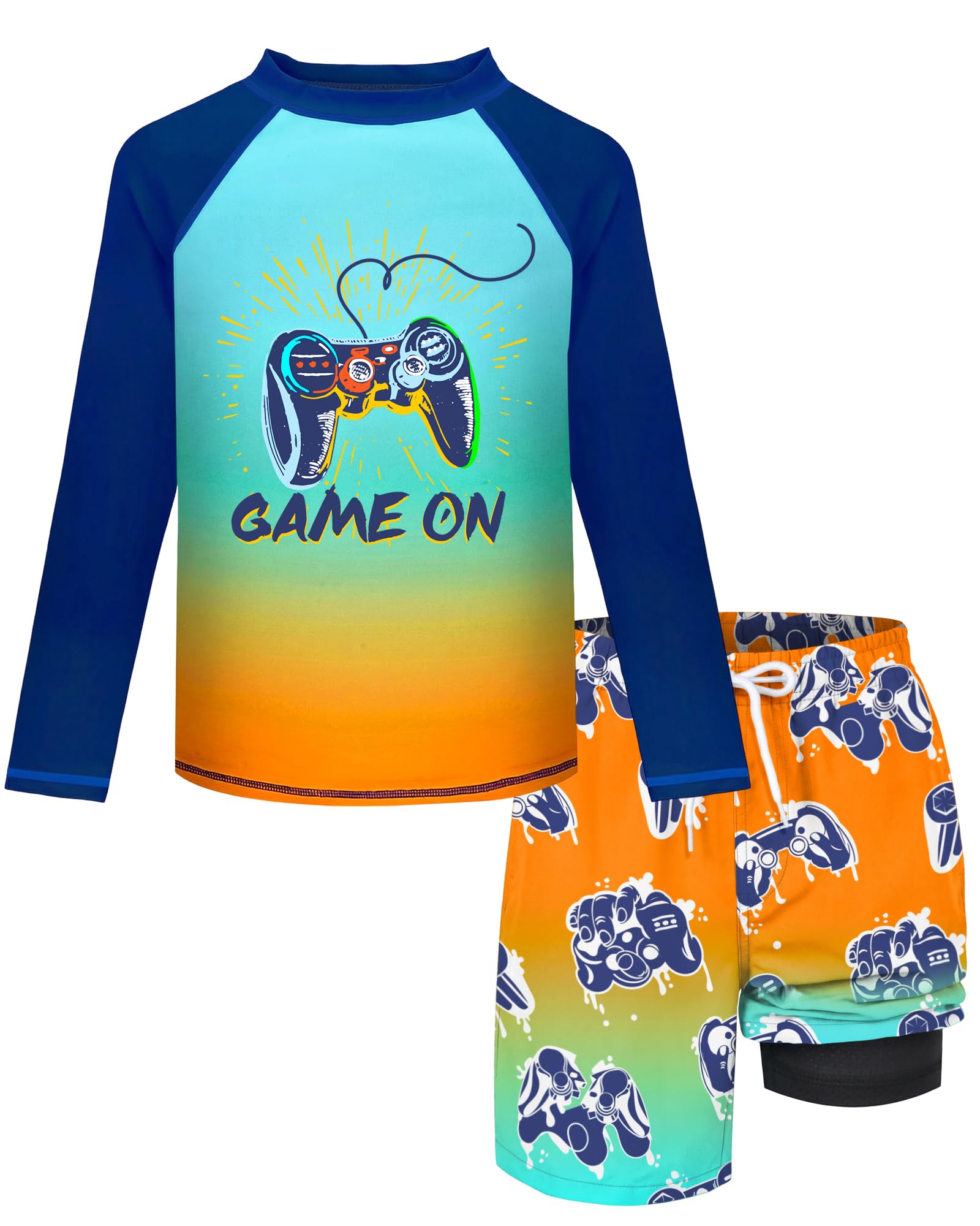 【Boys Swim set with Trunks】This boys long sleeve swim shirt is made of 85% polyester + 15% spandex, which is soft and comfortable, with great elasticity, easy to put on and take off, ensuring unrestricted activities. Start enjoying a happy summer now! 【No More Worrying About The Sun】This boys' swimwear sets has a UV protection index of UPF50+, and the long sleeves provide additional coverage and sun protection, which can effectively resist UV rays and protect the skin from damage. Wear our smooth, quick-drying 2 piece boys swim trunks set and enjoy a whole day of fun at the beach! 【Boys Swim Shorts】The waist is designed with a drawstring and elastic waist, which can be freely adjusted according to the waist size for a better fit. The boys' swim trunks provide side pockets for carrying personal items and convenient travel. The slightly loose trouser legs allow children to move freely without restrictions. 【Fashion Printing Bathing Suit】The boys swim trunks and rash guard sets uses a lively and interesting Hawaiian coconut tree and game controller 3D digital printing, which is not easy to fade. Perfect for swimming, summer beaches, water parks, pool parties, boating, surfing, cycling, etc. Your boy can explore freely and shine in the crowd, bringing more fun. 【Warm Tips】It is recommended to hand wash or machine wash in cold water, please refer to the size chart to choose the right size. If you have any questions about the boys bathing suits, please feel free to contact us, we will provide you with considerate customer service.