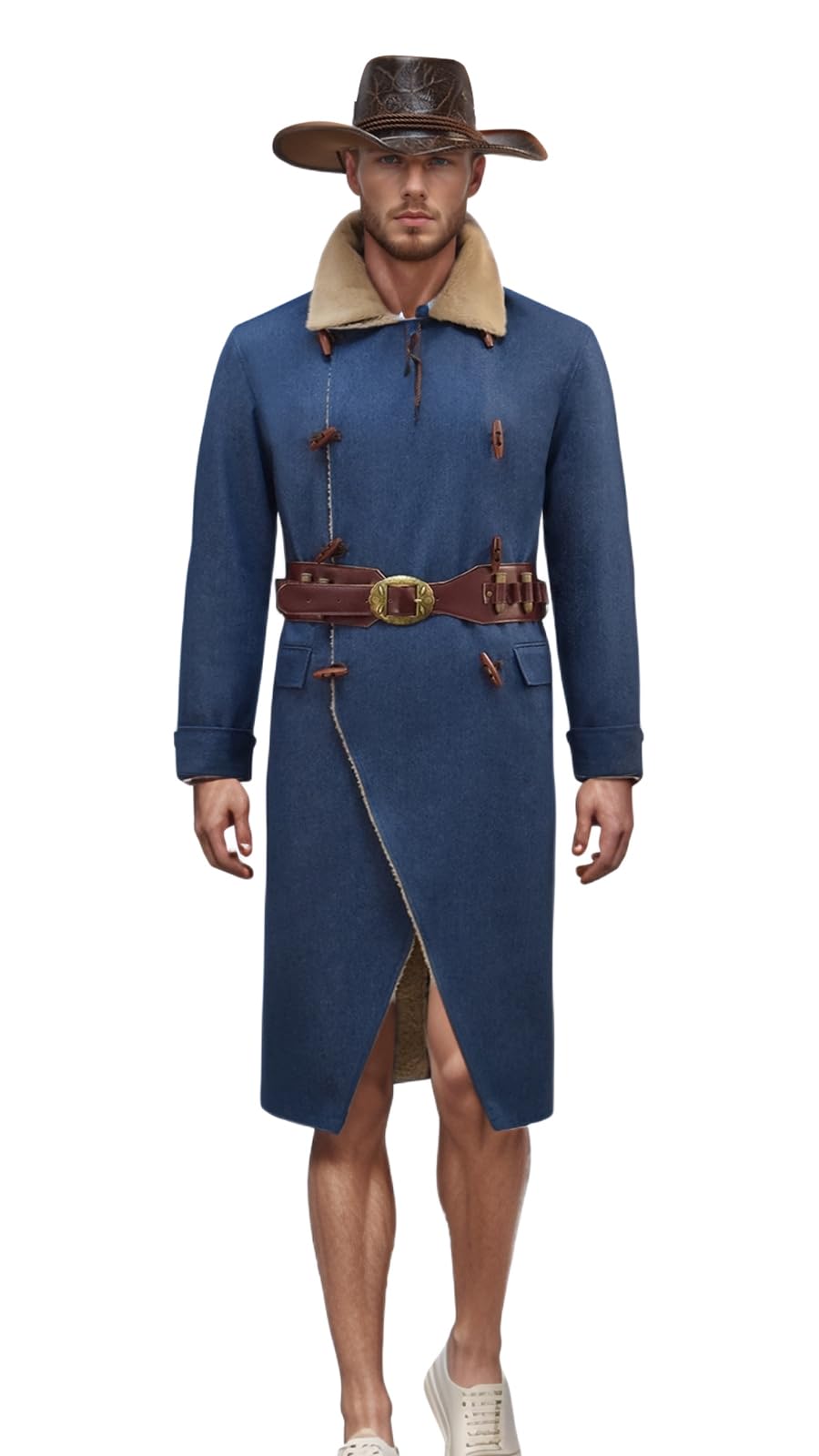 Arthur Morgan Cosplay Costume, Denim Blue Trenchcoat with Cowboy Hat and Belt, Adult Halloween Outfit
