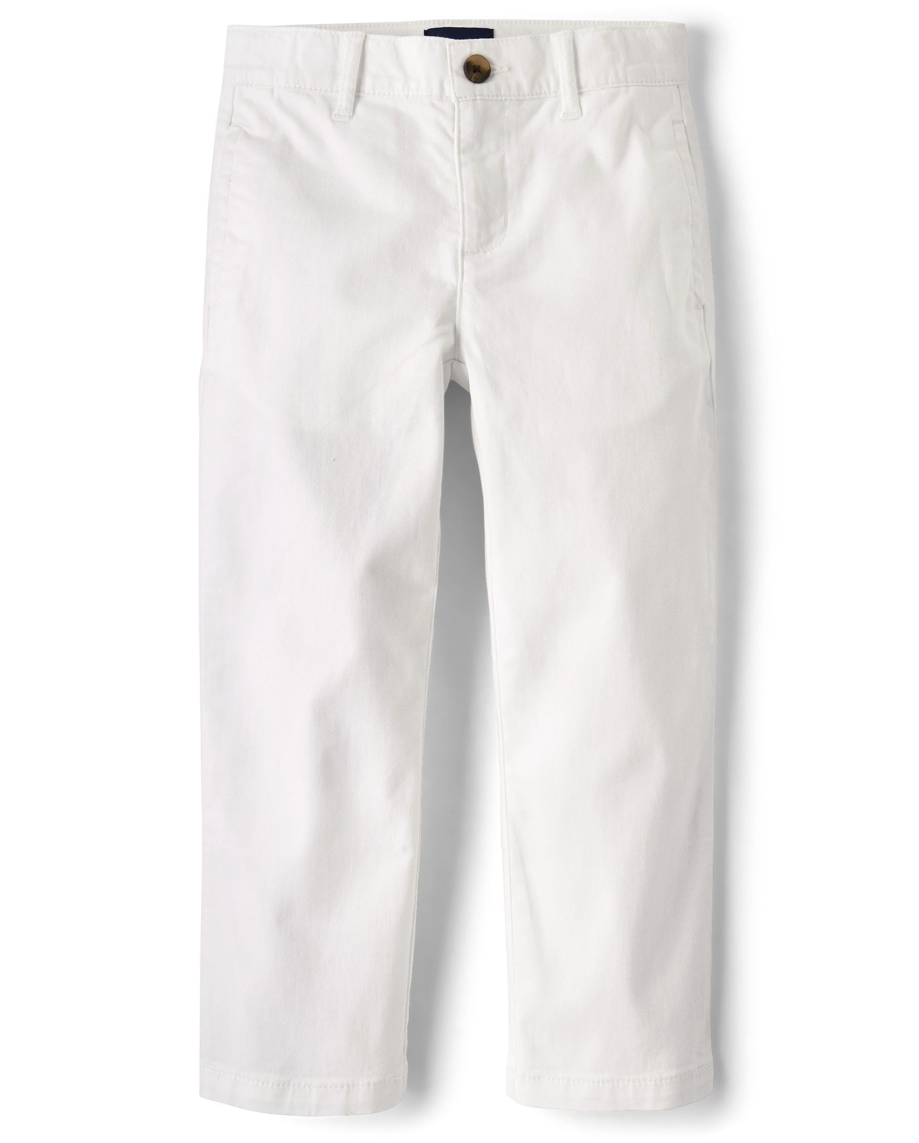 FABRICATION: 97% cotton/3% spandex twill body, 100% recycled polyester pocketing, imported FIT & DESIGN: Classic fit, mid rise, straight leg CLOSURE: Button with zip fly, inner adjustable waist tabs FEATURES: Soft hand feel, kid-perfect comfort, everyday durability, made-to-move stretch, naturally breathable cotton, belt loops, side-slant & back welt pockets, fabric finished for added softness & to reduce shrinkage