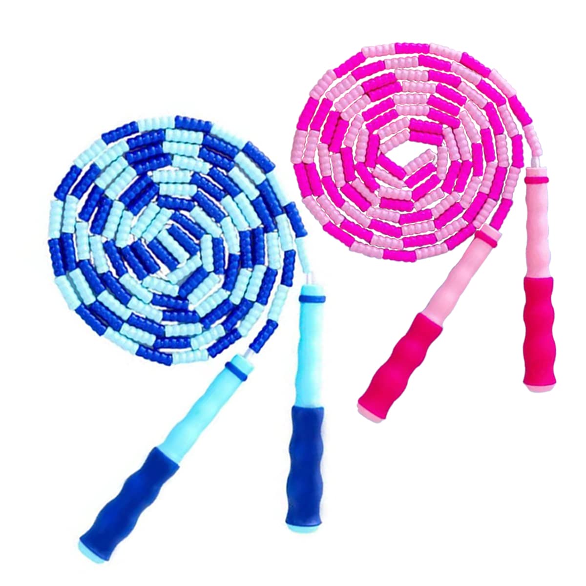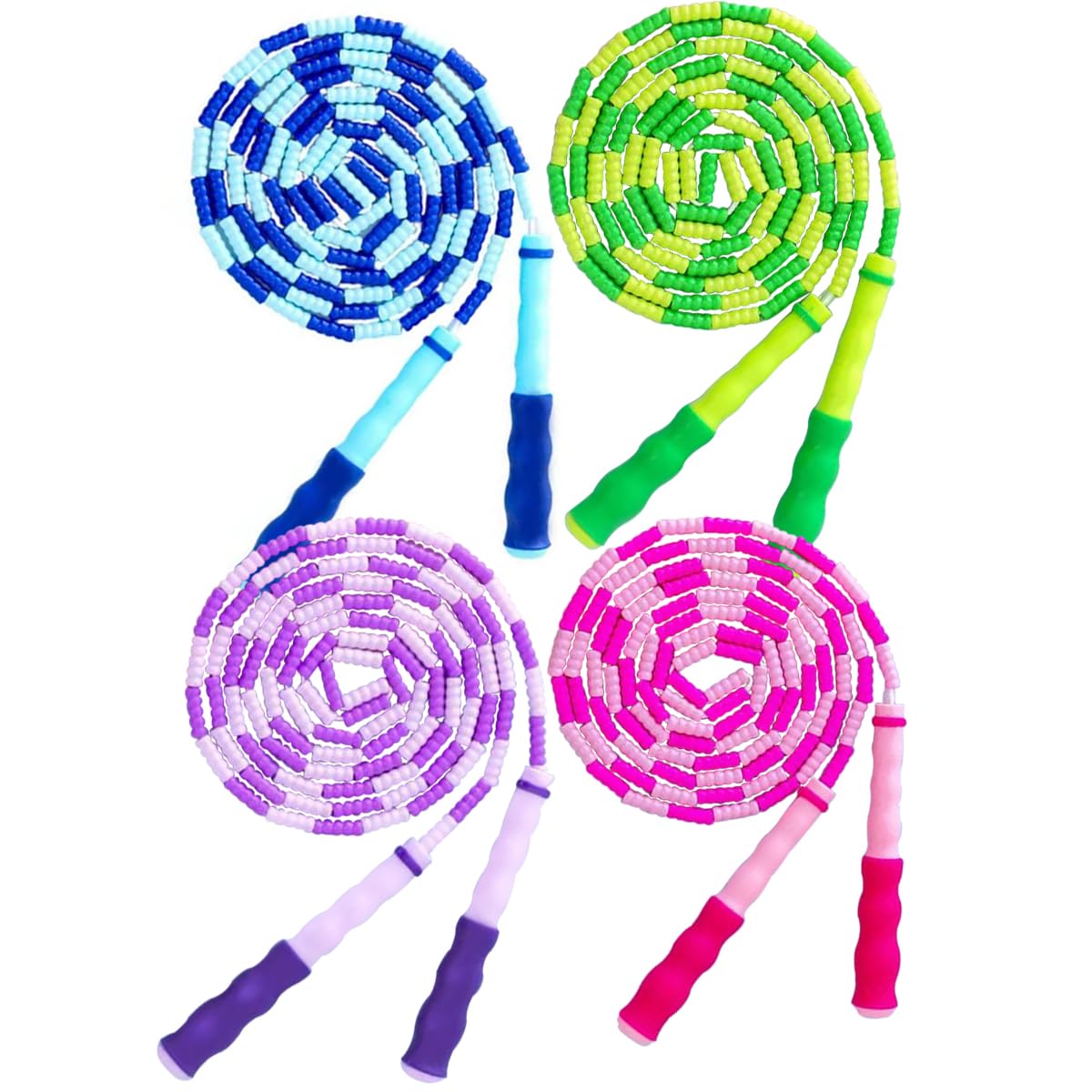 ✅【TANGLE-FREE & PORTABLE】 The Jump rope is made of solid long-lasting braided nylon cord and soft PVC segmented beads which is flexible, tangle-free, shatterproof and it won't hurt if it hits you accidentally, very safe for kids. In addition, we gave away storage bunch bag for each jump rope, it's portable to take it everywhere, convenient for outdoor exercise. ✅【COMFORTABLE ANTI-SLIP SILICON HANDLE DESIGN】 Wave-shaped handle design for a comfortable grip which fits in your hand perfectly and also has anti-slip properties.The handle is ergonomically designed with a soft glue wraparound wave of an anti-slip. Let children enjoy jumping rope. ✅【ADJUSTABLE LENGTH】 The jump rope length is 9.2 feet long (include the 6.7in long handle), there is a knot inside the handle,you can adjust the jump rope by 1)Pull the rope core out of the handle; 2)Remove the excess beads and cut off the excess rope; 3)Knot the remaining rope core; 4)Pull the rope core back to the hand.There is a height and corresponding jump rope length in the detail page for your reference. ✅【DURABLE JUMP ROPE】 High quality,tough and durable soft PVC beads is strong and wear-resistant, no damage to the floor when jumping rope. The bright color beads also fade resistant.With the braided nylon cord, this kids jump rope is designed to be tough. ✅【SUITABLE CROWD】 Due to the adjustable design, this skipping rope is suitable for kids girls and boys, children, students, adults women and men, such as beginners, trainers, outdoor and indoor activities for keep fit, workout, skipping tricks, exercise, weight loss and so on.Popular for kids and schools.It is a love gift choice for children's day, birthday gift, Christmas gift, etc.