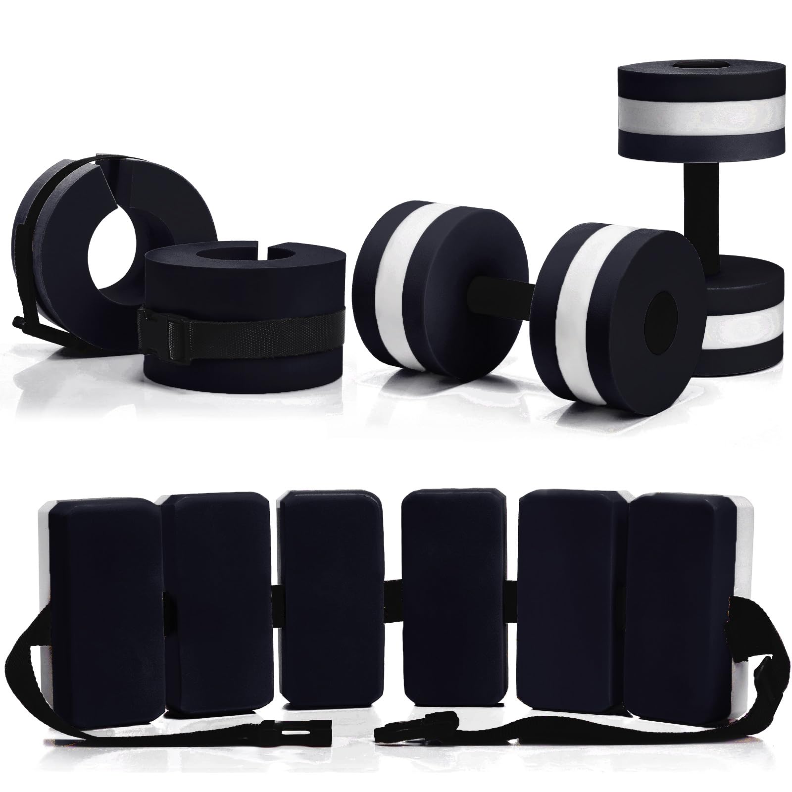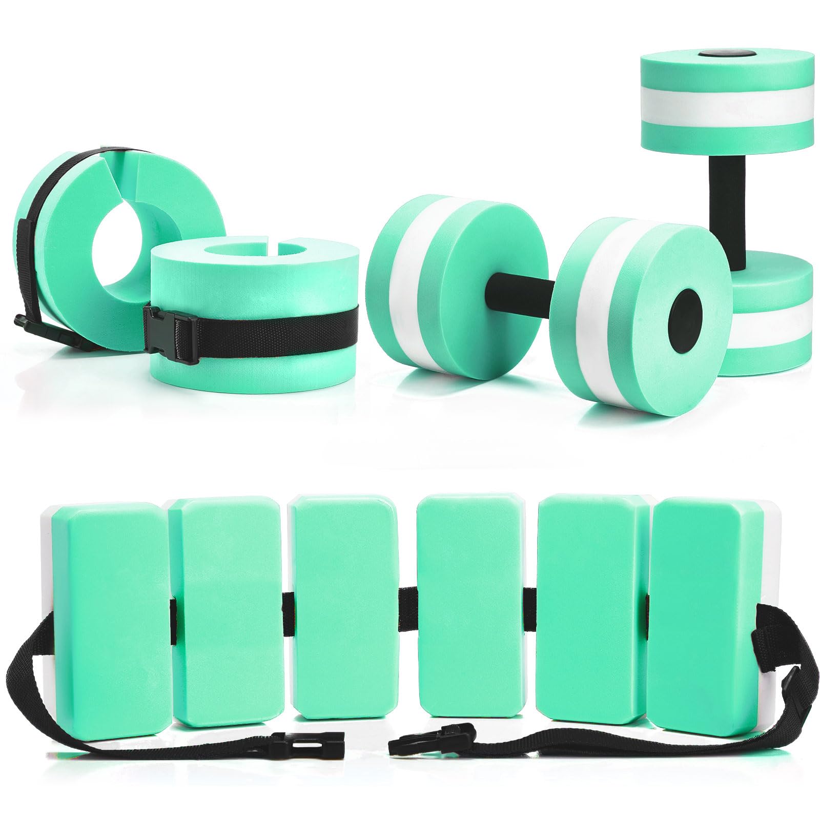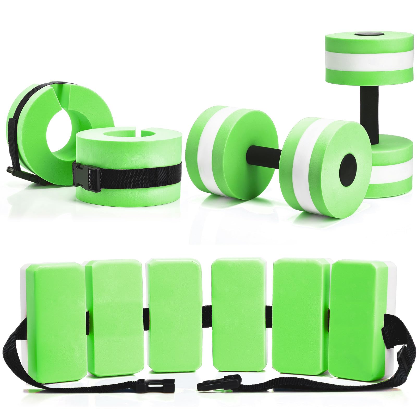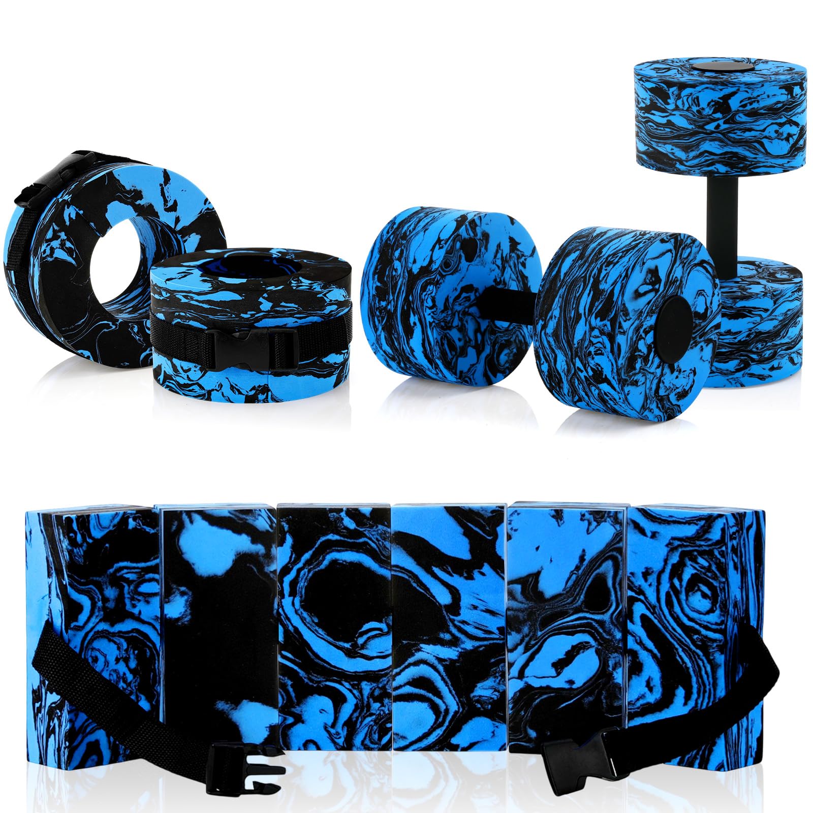 Complete Package for Water Fitness: this water dumbbell set is a comprehensive package for your water exercise regime, including 2 foam swim aquatic cuffs, 2 lightweight aquatic exercise dumbbells, 1 swim belt, which ensures a full body workout, improving your overall fitness Buoyant Dumbbell: the aquatic dumbbells are made of EVA foam, the handle is made of sturdy plastic and comes with a foam pad; Measuring about 10.6 inches in length, 6 inches in width, they are easy to grip, providing a comprehensive workout for your upper body, lower back and more, helping you build muscle endurance and improve flexibility Adjustable Ankle Swimming Weights: the ankles arms belts with quick release buckle measure about 1.66 inches thick and 3.95 inches high, the adjustable strap with quick release buckle makes it easy to wear or remove; Suitable for hanging ankles, legs and arms of swimmers with limited finger control and strength Practical Swim Belt: the water weights equipment consists of 6 EVA foam blocks, sized at around 16.6 x 5.9 x 1.85 inches, suitable for waist sizes from about 22.8" to 42.1"; The swimming belt comes with a durable adjustable shoulder strap and buckle that can be fixed at the waist for easy adjustment; Provides you with flotation assistance while in the water, ideal for non swimmers or beginner swimmers who need support Multipurpose and Efficient: whether you're practicing water aerobics, doing strength training, physical therapy or simply enjoying a fun time at the pool, our pool weights for water exercise set help you enhance your water activities by adding the right amount of resistance for an effective workout; They can be applied for more occasions, such as general swimming, swimming lessons, pool sports, underwater fitness and more