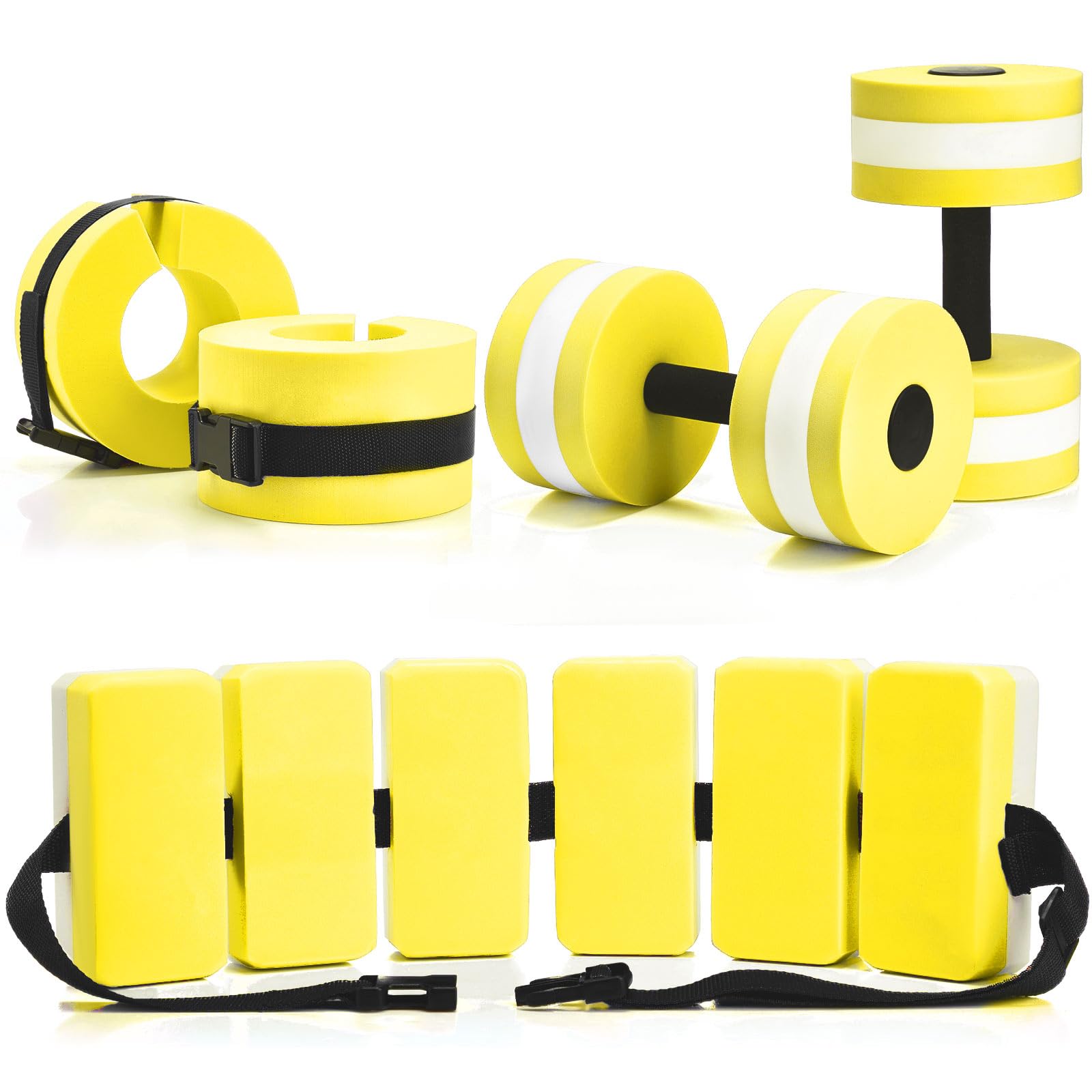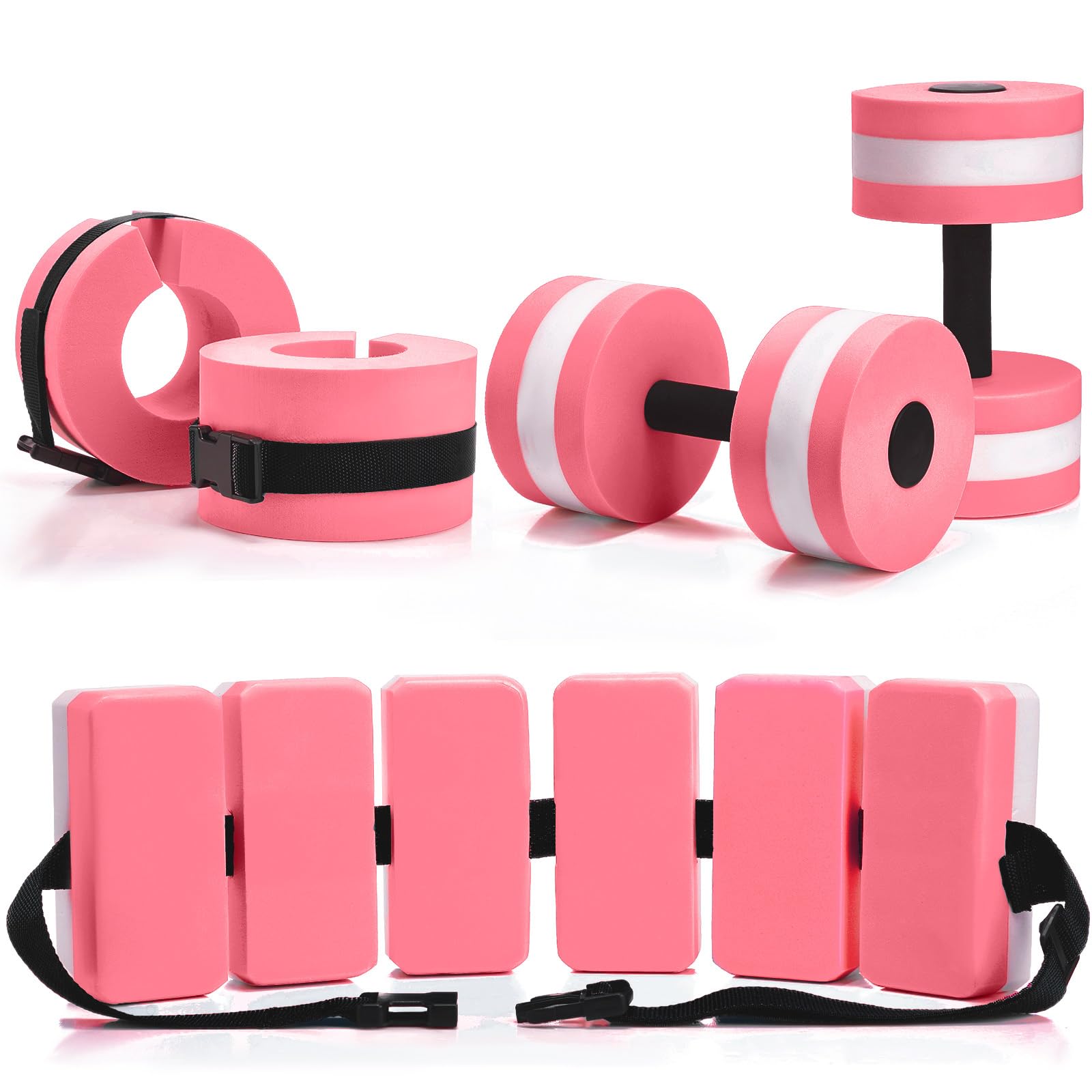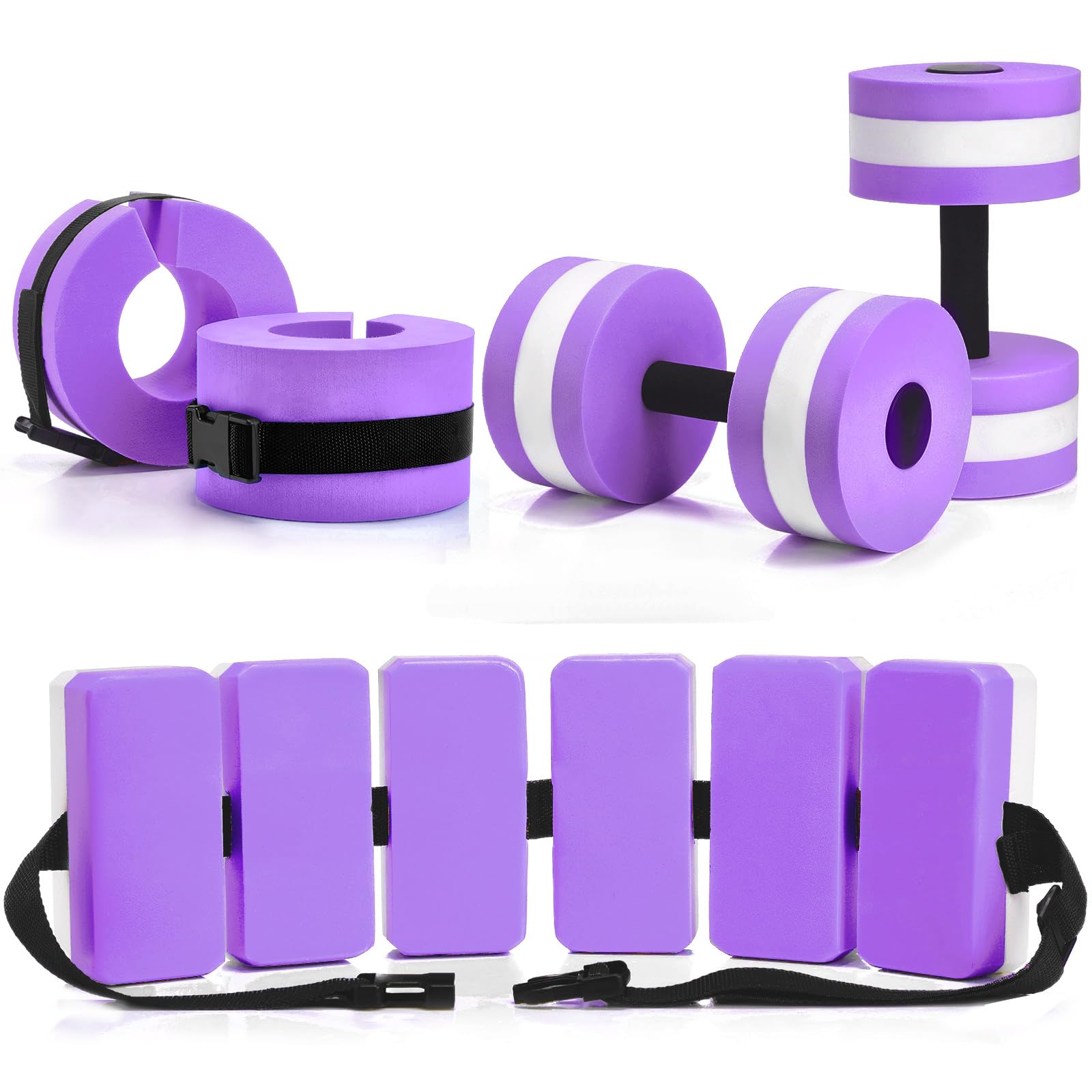 Complete Package for Water Fitness: this water dumbbell set is a comprehensive package for your water exercise regime, including 2 foam swim aquatic cuffs, 2 lightweight aquatic exercise dumbbells, 1 swim belt, which ensures a full body workout, improving your overall fitness Buoyant Dumbbell: the aquatic dumbbells are made of EVA foam, the handle is made of sturdy plastic and comes with a foam pad; Measuring about 10.6 inches in length, 6 inches in width, they are easy to grip, providing a comprehensive workout for your upper body, lower back and more, helping you build muscle endurance and improve flexibility Adjustable Ankle Swimming Weights: the ankles arms belts with quick release buckle measure about 1.66 inches thick and 3.95 inches high, the adjustable strap with quick release buckle makes it easy to wear or remove; Suitable for hanging ankles, legs and arms of swimmers with limited finger control and strength Practical Swim Belt: the water weights equipment consists of 6 EVA foam blocks, sized at around 16.6 x 5.9 x 1.85 inches, suitable for waist sizes from about 22.8" to 42.1"; The swimming belt comes with a durable adjustable shoulder strap and buckle that can be fixed at the waist for easy adjustment; Provides you with flotation assistance while in the water, ideal for non swimmers or beginner swimmers who need support Multipurpose and Efficient: whether you're practicing water aerobics, doing strength training, physical therapy or simply enjoying a fun time at the pool, our pool weights for water exercise set help you enhance your water activities by adding the right amount of resistance for an effective workout; They can be applied for more occasions, such as general swimming, swimming lessons, pool sports, underwater fitness and more