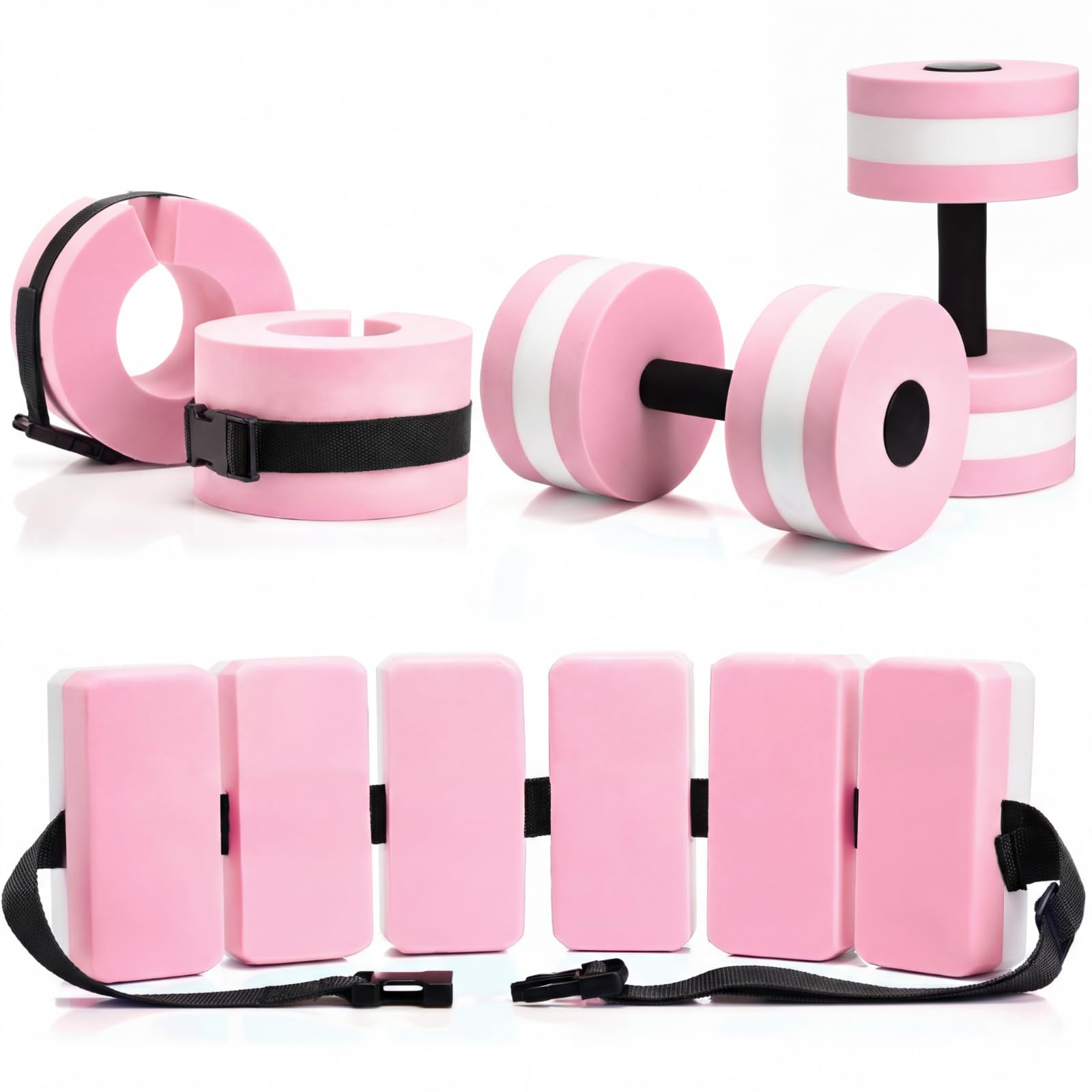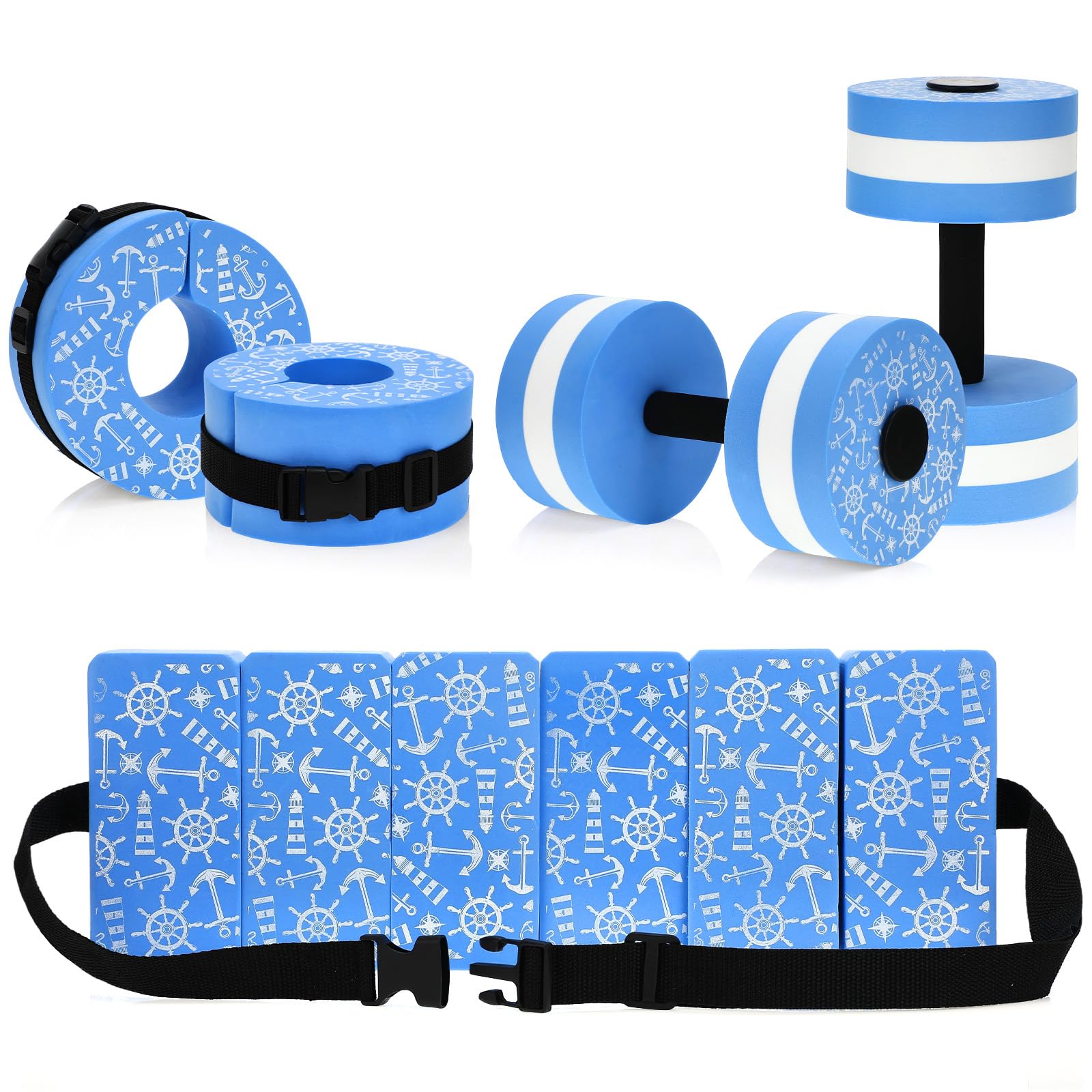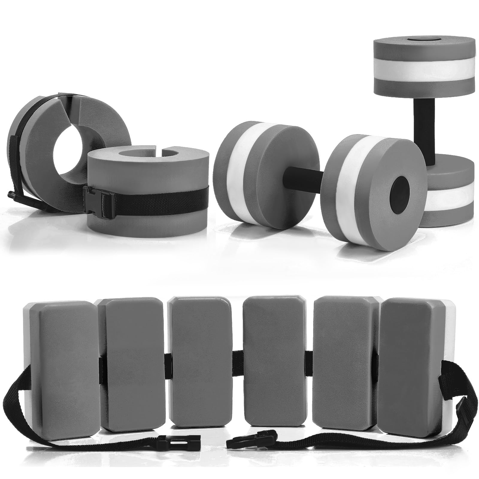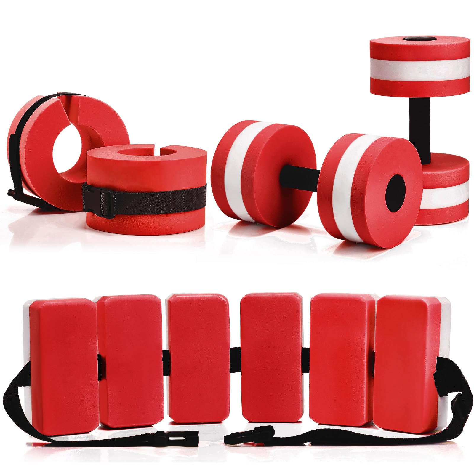 Complete Package for Water Fitness: this water dumbbell set is a comprehensive package for your water exercise regime, including 2 foam swim aquatic cuffs, 2 lightweight aquatic exercise dumbbells, 1 swim belt, which ensures a full body workout, improving your overall fitness Buoyant Dumbbell: the aquatic dumbbells are made of EVA foam, the handle is made of sturdy plastic and comes with a foam pad; Measuring about 10.6 inches in length, 6 inches in width, they are easy to grip, providing a comprehensive workout for your upper body, lower back and more, helping you build muscle endurance and improve flexibility Adjustable Ankle Swimming Weights: the ankles arms belts with quick release buckle measure about 1.66 inches thick and 3.95 inches high, the adjustable strap with quick release buckle makes it easy to wear or remove; Suitable for hanging ankles, legs and arms of swimmers with limited finger control and strength Practical Swim Belt: the water weights equipment consists of 6 EVA foam blocks, sized at around 16.6 x 5.9 x 1.85 inches, suitable for waist sizes from about 22.8" to 42.1"; The swimming belt comes with a durable adjustable shoulder strap and buckle that can be fixed at the waist for easy adjustment; Provides you with flotation assistance while in the water, ideal for non swimmers or beginner swimmers who need support Multipurpose and Efficient: whether you're practicing water aerobics, doing strength training, physical therapy or simply enjoying a fun time at the pool, our pool weights for water exercise set help you enhance your water activities by adding the right amount of resistance for an effective workout; They can be applied for more occasions, such as general swimming, swimming lessons, pool sports, underwater fitness and more