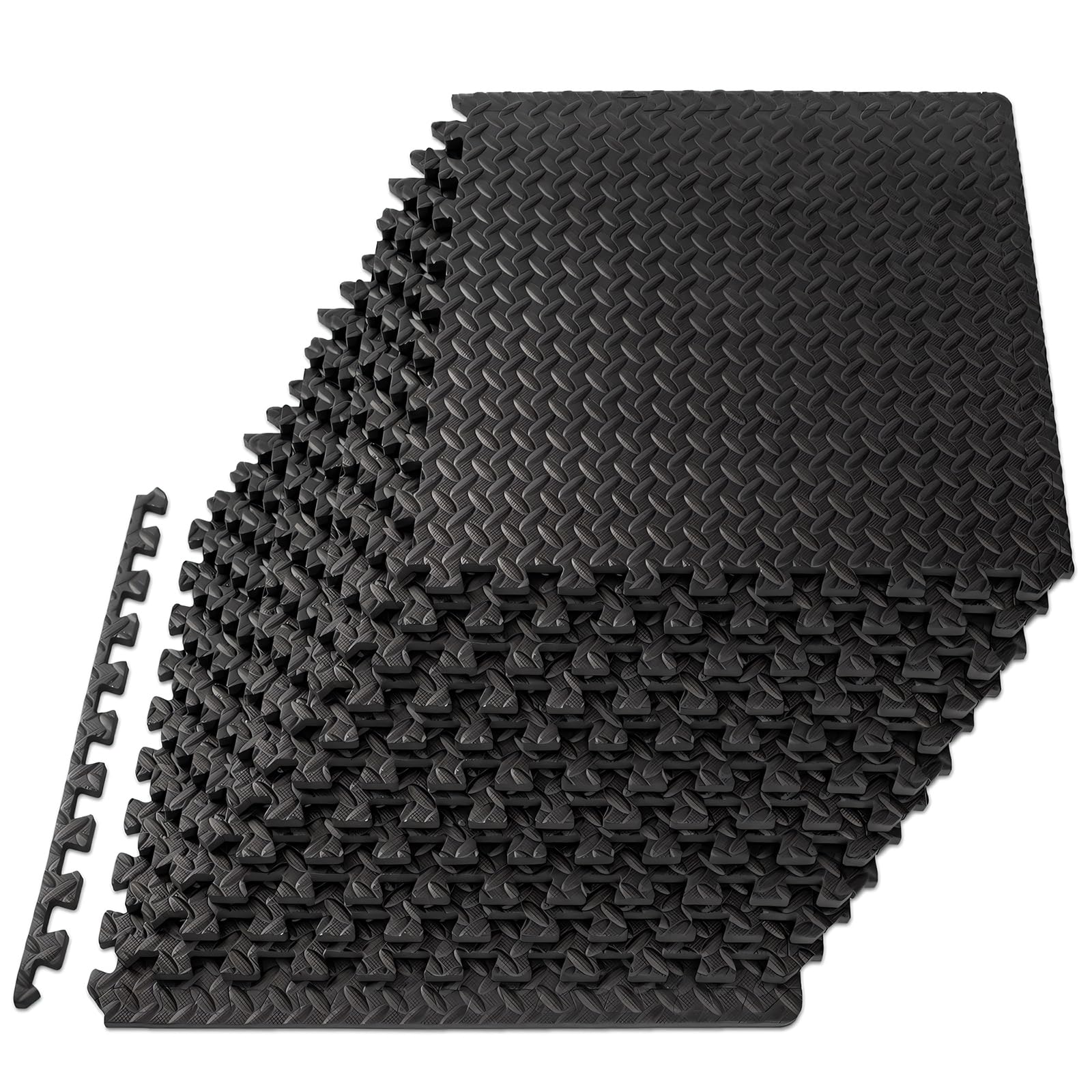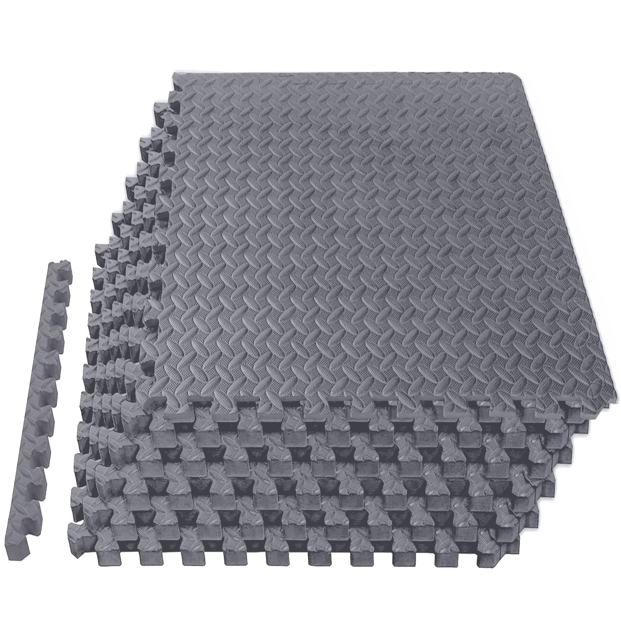 Covers Large Space: Mat Block interlocking foam tiles measure 23.6"L x 23.6"W x 0.5" thick covering a 144 square foot area, which can meet your basic exercise needs. These foam tiles are perfect for gym and home exercise rooms, which avoid excessive weight that cause indents to the floor Easy Assembly: The puzzle floor mat can be connected and disassembled for storage quickly and easily. While our exercise equipment mat can be easily removed and attached as you like via borders within less than 3 minutes ​High Quality Materials: Non-skid, high-density and shock-absorbing EVA gym mat flooring provides excellent support and cushioning to keep you comfortable while using it; The foam mats consist of NO toxic phthalates. An excellent alternative to rubber floor mat Versatility: The interlocking foam tiles have a water-resistant and noise-resistant design which is easy to clean with soap or water. The grippy, non-slip surface provides enhanced safety as our foam floor mats also have tear and abrasion resistance, which is very durable and can be reused many times Application: Mat Block interlocking foam tiles give you shock-absorbing comfort while doing yoga, Pilates or weightlifting. You can also use the foam tiles in garages, kitchen trade shows and more places. The exercise equipment mat can also be used to create a soft, non-slip floor while camping or playing