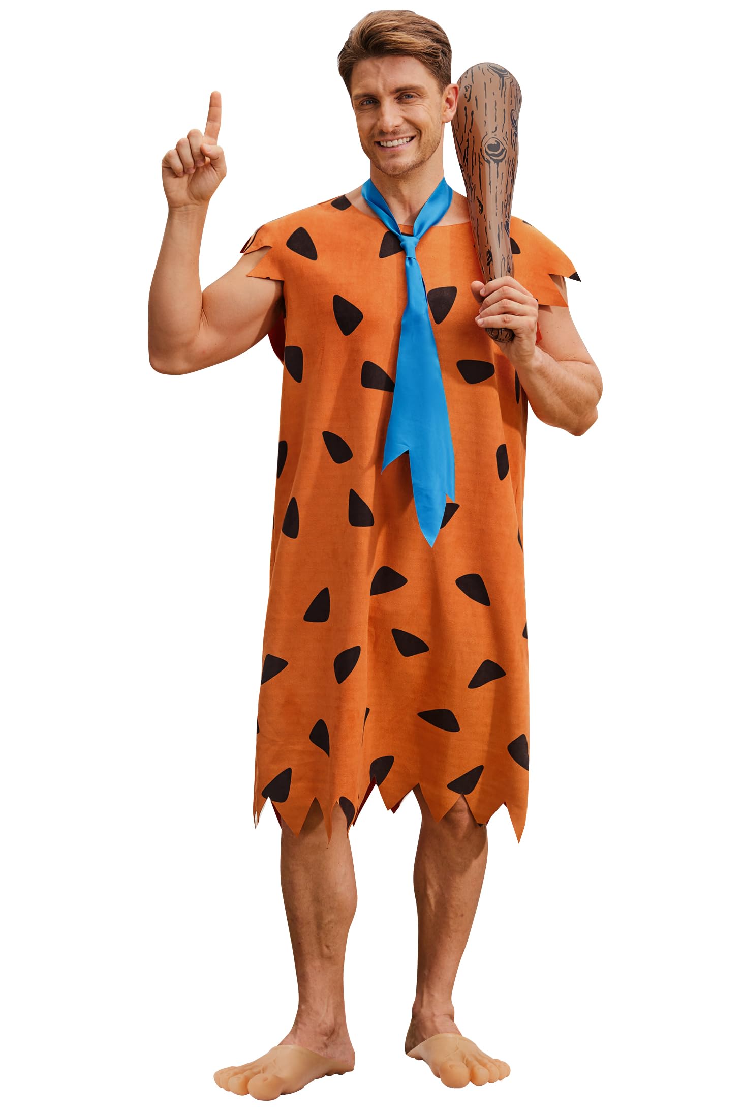 CAVEMAN COSTUME: The design of the costume is inspired by the iconic character from the original animation. It will send you on the wildest of adventures back in the stone age! Step into the prehistoric world with caveman and experience the fun of living life in the Stone Age. From quirky adventures to iconic moments, this costume is the perfect throwback to animated classics, making your Halloween feel like a fun filled time warp! COMFY FABRIC: The tunic is made from highend SUEDE FABRIC, offering a luxurious texture and comfortable fit. The accessories are crafted from durable materials, making sure you look your best while staying comfortable through every prehistoric event. DETAIL: The orange suede tunic uses primitive design, there is a deep blue tie included for authentic styling. Complete 3 piece set includes tunic, tie and inflatable cave man bat. OCCASIONS: Whether you're headed to a Halloween costume party, masquerade ball, or themed event, this costume is ideal for adding a dramatic flair to any role playing game or social gathering. AFTER-SALES SERVICE: Mainfini is committed to ensuring quality and customer satisfaction through our dependable after-sales service. Please refer to the SIZE CHART before ordering. For more Halloween outfits, search for "Mainfini Halloween".