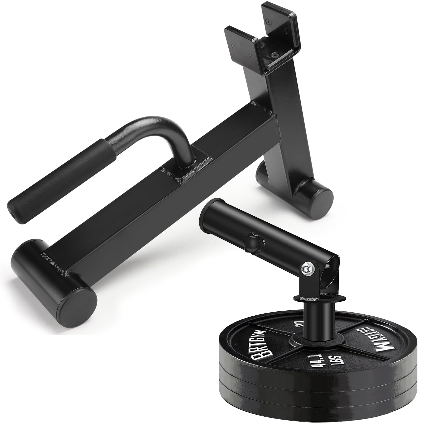 Made to Last: The BRTGYM deadlift jack is constructed of high-quality Carbon Steel and it's sturdy enough to lift a bar loaded with 600 lb. Solid welds seams ensure the stability of the base. T Bar Row Landmine Strong Welding and made of durable steel, black powder-coated for anti-corrosion. Space Saving: The barbell bent-over row is a common practice at most gyms and uses barbells or dumbbells to engage the back muscles fully. With our BRTGYM landmine attachment, you can do it at home.Great for small spaces like living rooms and garages. Fit 2" Olympic Barbell &Easy to install: 8.5" long tube for safety security. Simply insert the barbell into the tube, and adjust the heft as you see fit. And then tighten the knob for a secure workout. ABS tube sleeve to prevent barbell being scratched. And flanging bearing bushing is designed to prevent wear too. A Must-Have Back Saver: It's a piece of auxiliary equipment that takes a lot of strain off your back when setting up your weights for deadlifts and t-bar rows, make loading and unloading plates so much easier and quicker. Change weight plates in seconds and focus on your exercise plan Built-in Pullback Handle: Covered with a rubber sleeve to ensure a firm and stable grip. Also built for portable use. BRTGYM jack is 5.73 lb weight, so it's convenient to take it to the gym. The gap at the top is 2" wide with plenty of room to hold a universal barbell. Padded with black UHMW plastic to protect the knurling on your nice barbells Multiple Exercises; 360° rotating features allows multiple workouts:haft kneeling shoulder press, lateral lunge, landmine press, overhead squat,etc.
