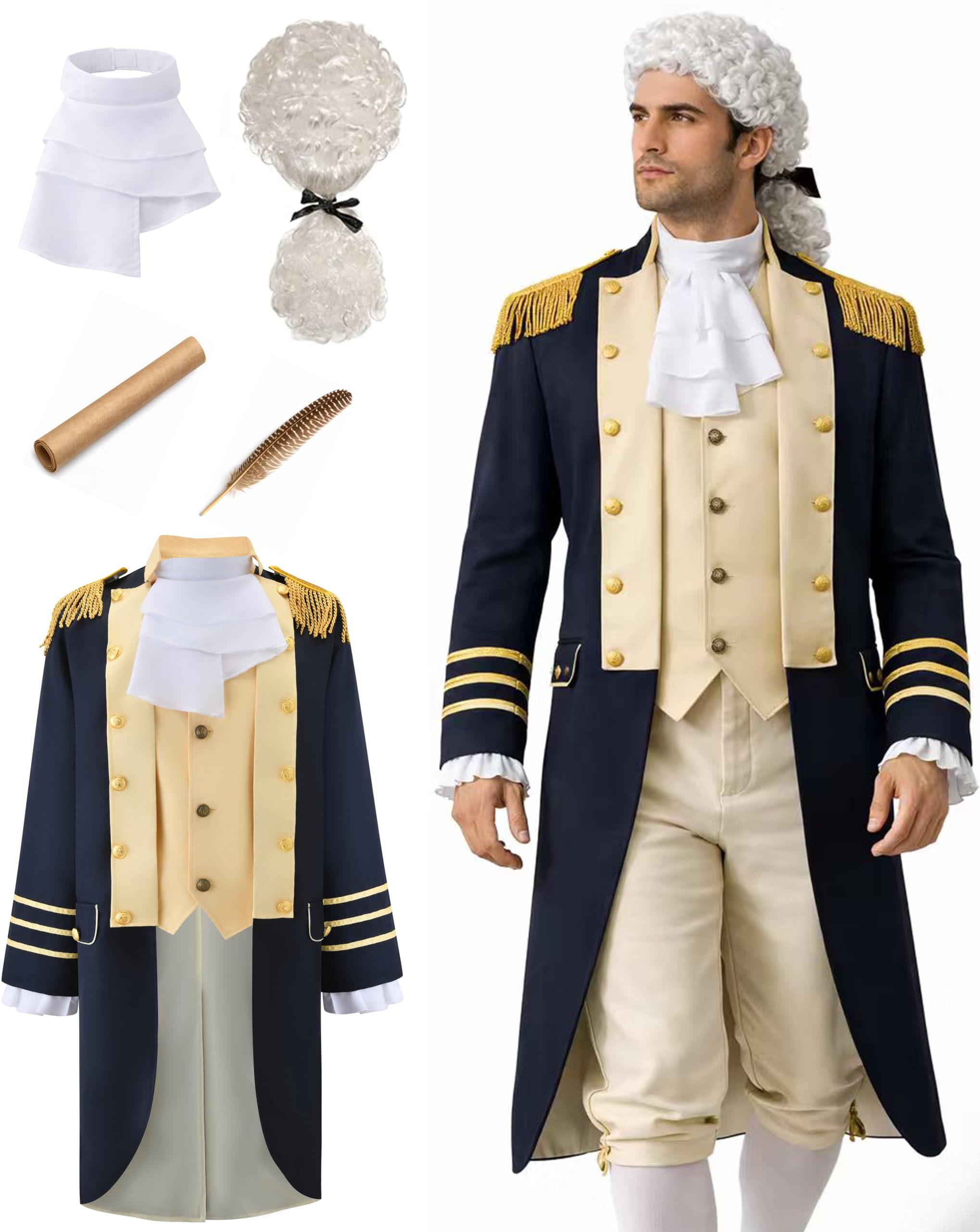 Founding father costume set: Includes 1 jacket, 1 powdered wig, 1 white collar, and 1 kraft paper prop. Designed as a complete men’s colonial-style outfit. Designed for adult role-play: Revolutionary War general outfit styling with a structured design. Jacket made from a new fabric, and wig upgraded for improved fit, suitable for a wider range of adults. US sizes S–3XL: Available in standard US men’s sizing from S to 3XL, covering a broad range of adult body shapes. Fit reference: 5'9", 180 lbs wears L. For a looser fit, consider ordering one size up. Versatile historical: Suitable for Halloween dress up, American history school events, wax museum presentations, Independence Day, Presidents Day, stage performances, masquerade, and colonial-themed parties. After-sales service: Any product-related issue is handled within 24 hours.