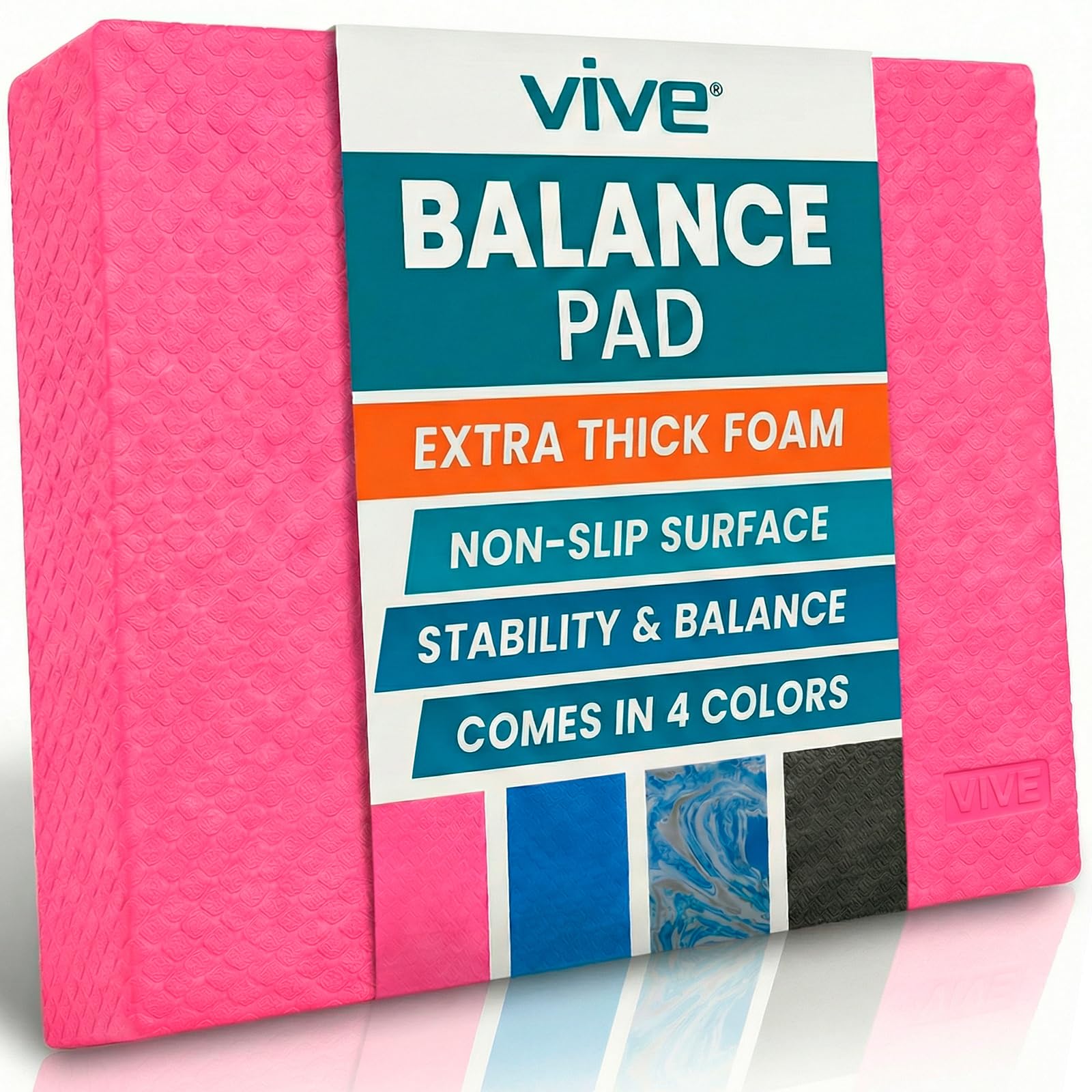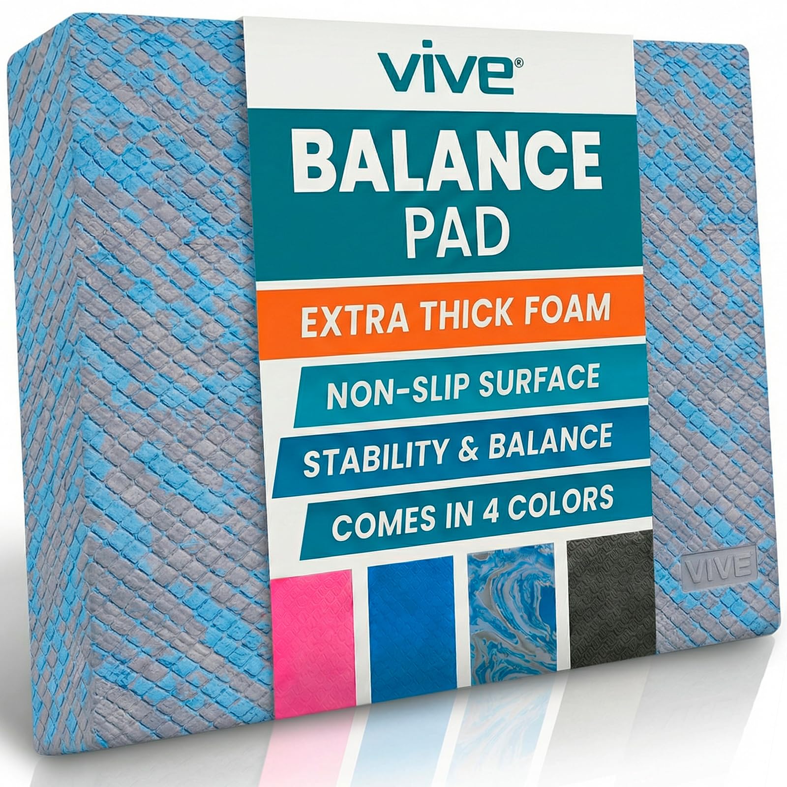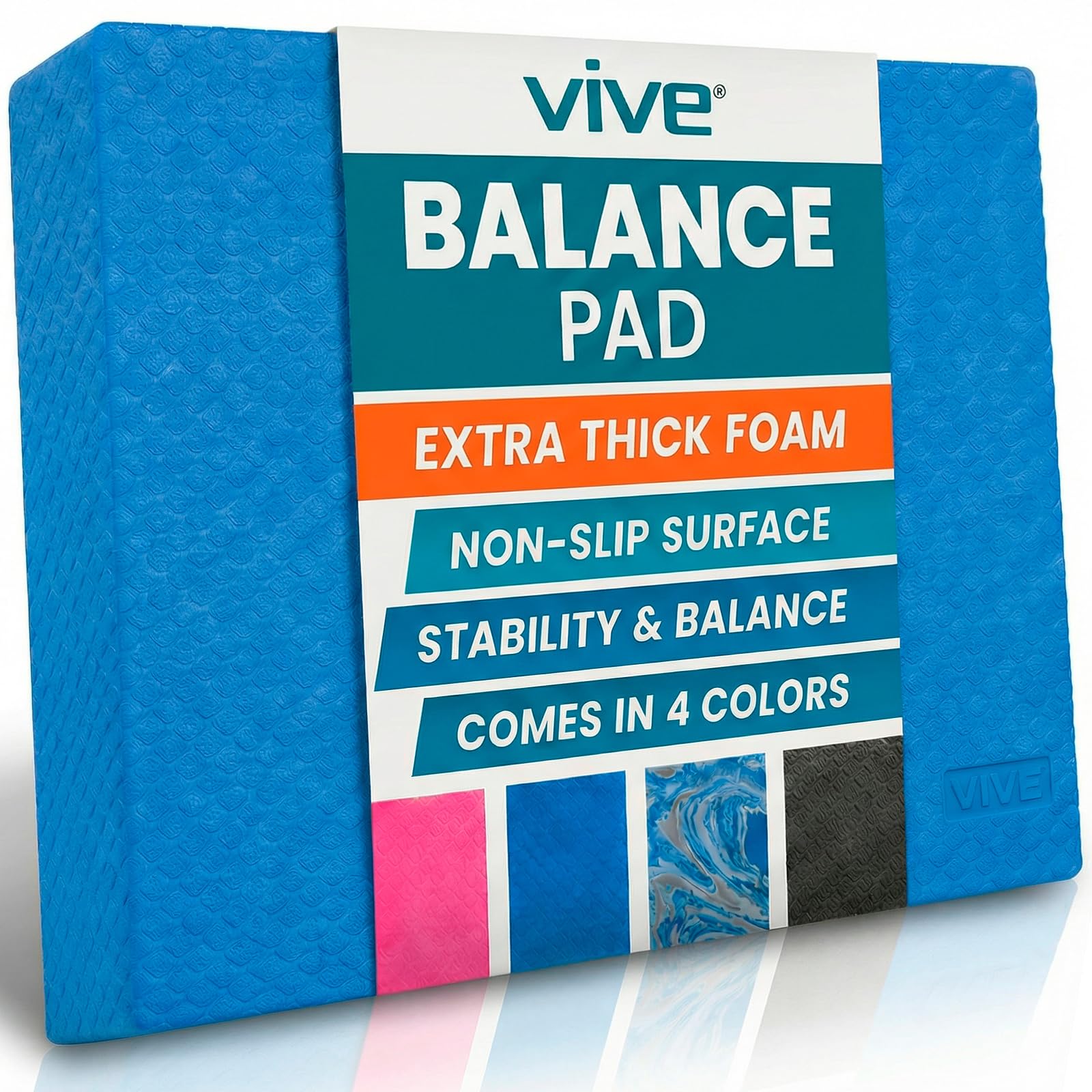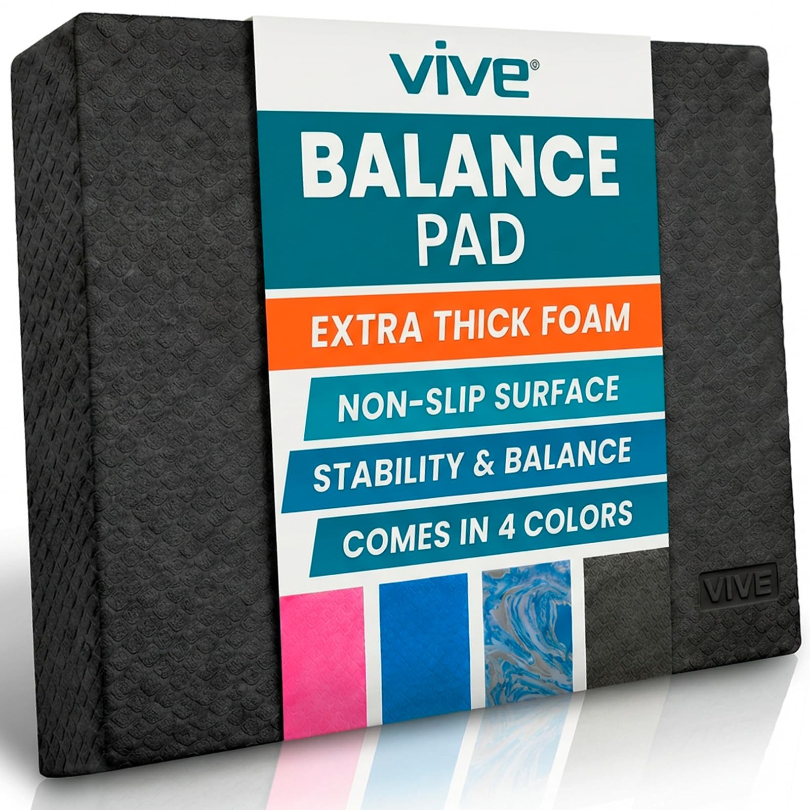 IMPROVE STRENGTH, BALANCE AND MOBILITY: Easily integrating into any workout routine, physical therapy or rehabilitation program, the Vive balance pad provides a safe, destabilized surface to improve overall balance and increase core strength. Perfect for seniors and those recovering from injury or surgery, the durable foam balance pad increases joint stability and motor skills, safely strengthening weak ankles, knees and hips. EXTRA LARGE TEXTURED PLATFORM: Lightly textured to provide a nonslip surface that is safe for use barefoot or with shoes, the balance pad also has a textured nonslip base to prevent slipping and sliding while in use. The extra large cushioned platform measures 15.8” by 13.4”, easily accommodating wider stances and all shoe sizes. VERSATILE USE: Great for rehabilitation following an injury or surgery, the balance pad is also a useful addition to yoga, pilates and general exercise. Lightweight and portable, the foam balance pad can also be used as a comfortable seat cushion or foot elevator at home or on the go. DURABLE FOAM MATERIAL: Resilient, closed-cell foam is tear-resistant, safely supporting up to 300 pounds. The thick, latex-free 2.4” foam balance pad is also water-resistant, repelling sweat. Easily clean the balance pad with a damp cloth and mild detergent before drying with a lint-free cloth. VIVE GUARANTEE: 60 day unconditional guarantee so you can purchase now with confidence.