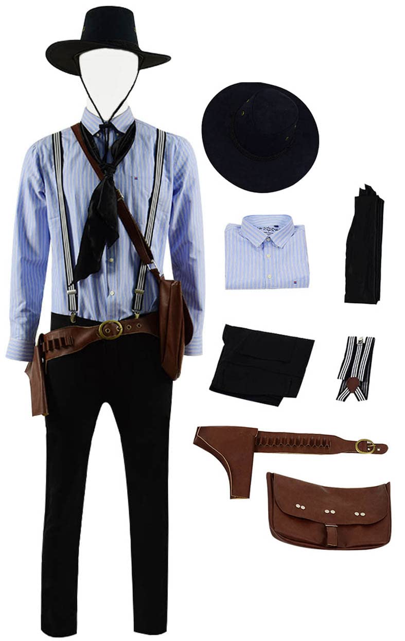 Adult Red Action Game Dead Redemption Cosplay Arthur Morgan Costume Suit Teens Jungle Adventures Clothing Cowboy Hat Blue Stripes Shirt Suspenders Pants Full Set with Holster Bag and Necktie Hot Game Figure Arthur Morgan Role Playing Outfit Casual Shirt Trousers with Cool Cap and Other Accessories Jungle Hiking Costume for Men Boys Halloween Theme Parties Cosplay and Stage Shows. Features: Overall design of the full set jungle costume highly restores the figure of Arthur Morgan in hot action game. Black hat protects wearers from sunshine and rain meanwhile is eye-catching. Attached bag and holster are useful for jungle adventures searchers. Stripes shirt and suspenders pants add liveliness and retro chic feelings to wearers. Material: Premium Faux Leather + Polyester + Cotton, soft and smooth to touch meanwhile breathable and comfortable to wear. Package includes: Shirt + Pants + Suspenders + Hat + Bag + Holster + Necktie. As the pictures have shown. Occasion: Perfect for Halloween, Christmas, carnival, annivesary, theme parties, masquerade, game exhibitions, jungle adventures, travelling, stage and theater performance. Also a great birthday gift for your friends or families. Size: Standard US male size. Please refer to the detailed size information in product description when you make an order.