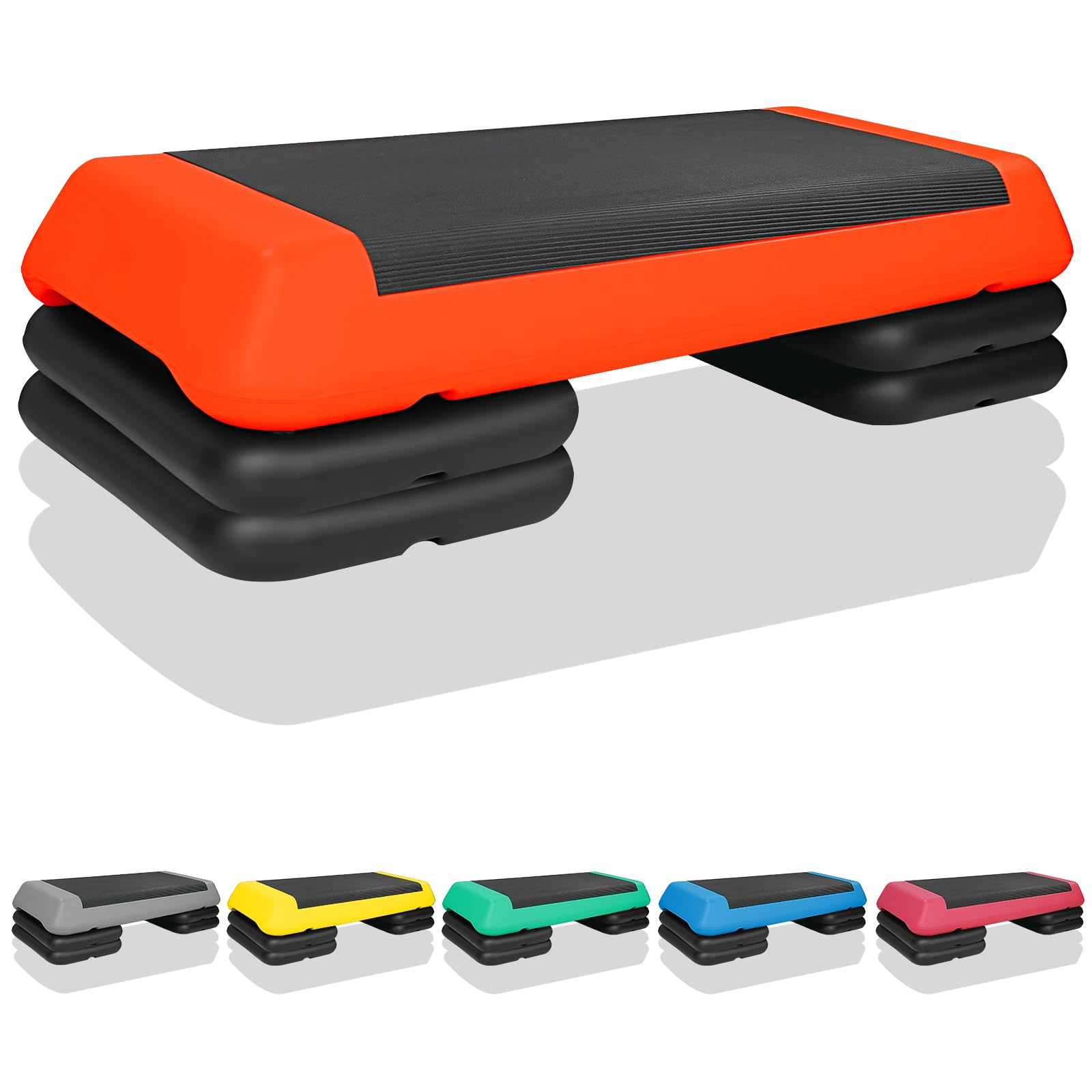 【Dimensions】(28.5”L x 14.5”W x 4”H ,7.5 lb) support blocks 2” height when placed in position,no assembly required, easy to carry and convenient to store,suitable for exercising on all occasions. 【Flexible Adjustable】Adjust the height from 4” to 6” to 8”, perfect for beginners or advanced athletes work out at home. 【Safe Materials】Non-slip surface on platform that supports up to 550lb. 【Function】Aerobic stepper shape your hamstrings with alternating lunges and strengthen your chest and back muscle by doing pushups. 【Compact and Potable】 It is lightweight and easy for you to carry it anywhere like the office, gym or outdoors. The stackable risers can be easily stored underneath the platform that you can store it under your bed or sofa.