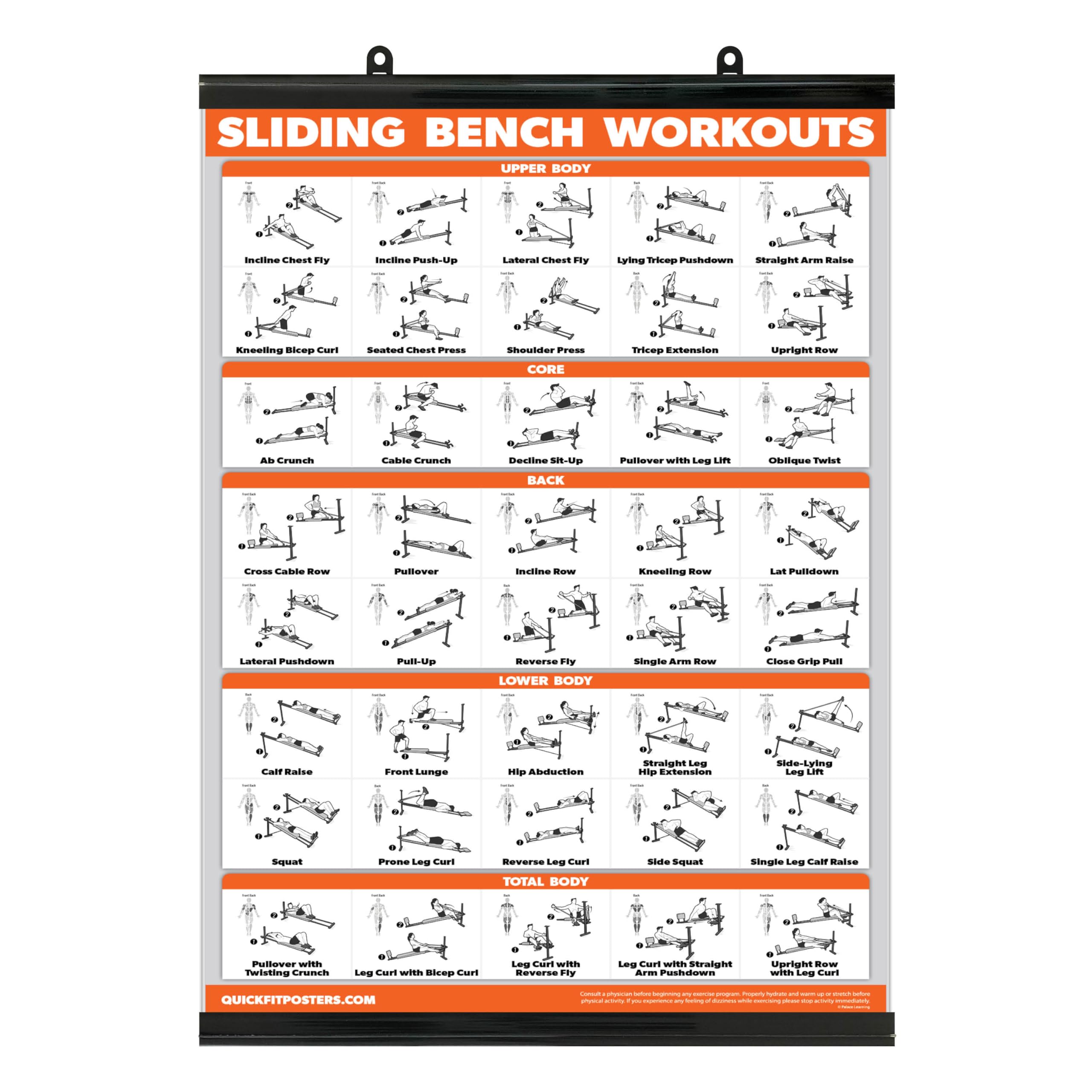 QUICKFIT Sliding Bench Workout Poster - Compatible with Total Gym, Weider Ultimate Body Works - Incline Bench Exercise Chart (LAMINATED, 18" x 24")