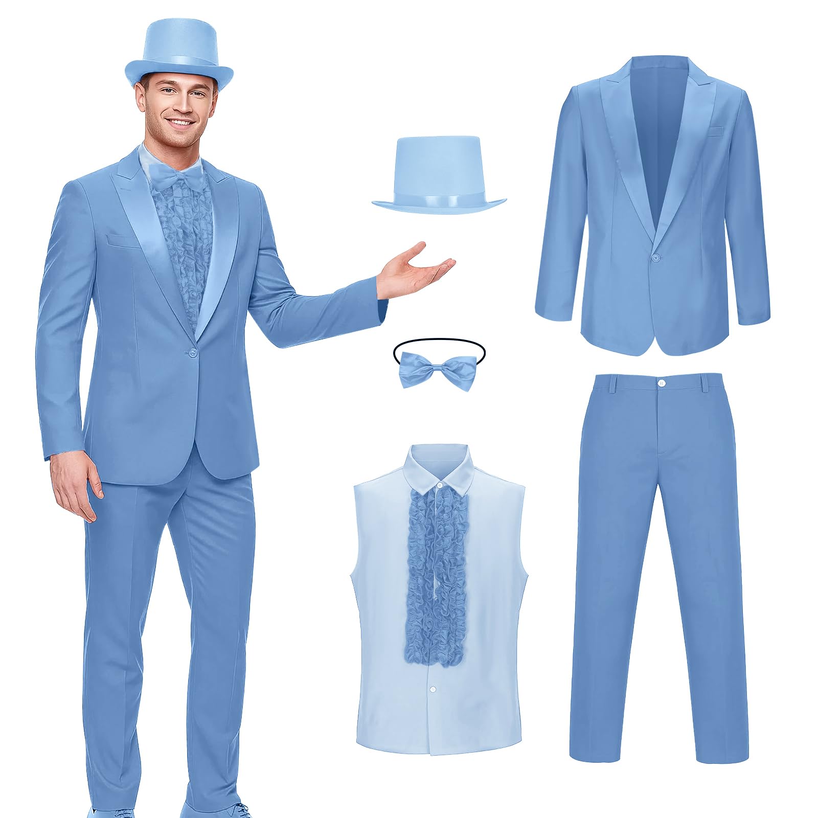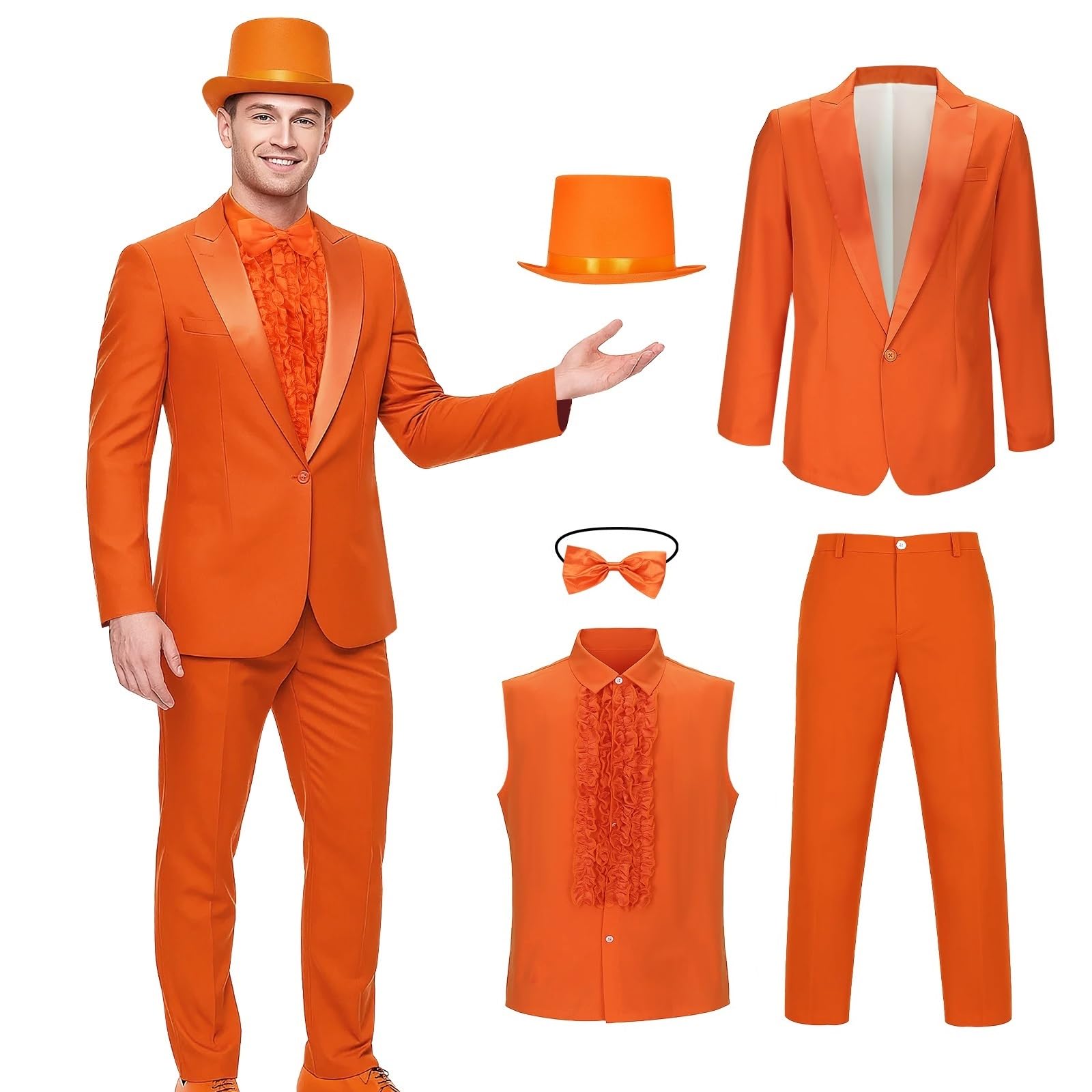Name: Lloyd and Harry Costume Blue Tuxedo Orange Shirt Blazer Suit Men Halloween Comedy Movie Character Cosplay Top Hat Jacket Pants Uniform Set for Men Adult Material: Our suit set tuxedo outfit is made of polyester, breathable and skin-friendly, comfortable and lightweight to wear. 💕 Package Includes: Jacket + Shirt + Pants + Hat + Bow Tie. Features: Halloween costume outfit features one-button closure, long sleeve, ruffles design at placket, a decorative mock pocket at left chest, 80s 90s retro style, bright color and exquisite craftsmanship will make you look perfect and eye catching. Occasions: Lloyd and Harry cosplay suit is suitable for daily wear, Halloween, carnival, role play, stage performance, masquerade, dance recitals, fancy dress up party and other occasions or festivals. It’s also a sweet gift for film lovers. Size: S/M/L/XL/XXL. Please refer to the SIZE CHART for best fit. If you have any question with our orange blue tuxedo suit, please feel free to contact with us.