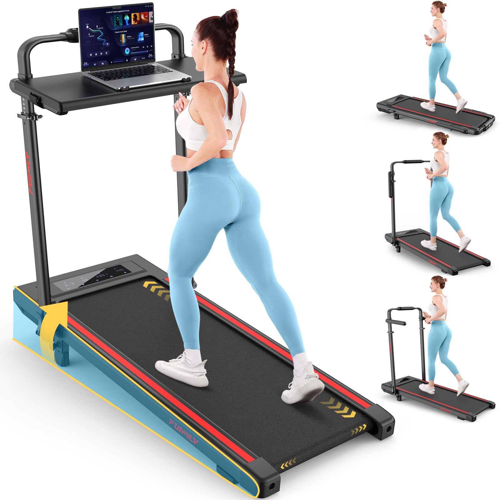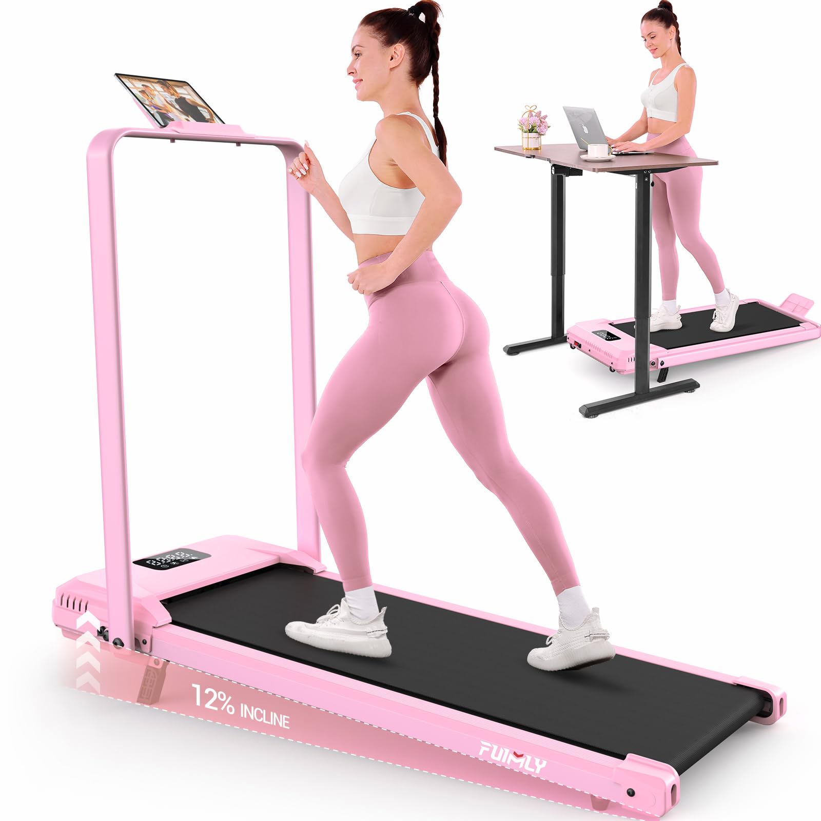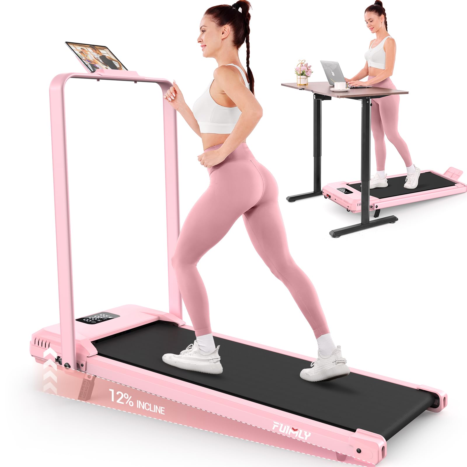 2025 Multi-Function FoldableTreadmill: Our 4 in 1 walking pad treadmill integrates numerous practical functions, combining the space adaptability of an under-desk treadmill, the professional performance of a traditional treadmill, the incline training capability of a climbing treadmill, and the safety stability of a treadmill with handle bar. 12% Max Incline Treadmill: This innovative portable treadmill features a 2-level manually adjustable incline system with a 12% maximum gradient that realistically simulates uphill climbing to target specific muscle groups (glutes, calves, and core), burns up to 3X more calories than flat treadmills per hour. Enhanced Safety Treadmill with Handlebars: Our treadmill features reinforced handle bar that provide balanced support. The anti-sway design allows rehabilitation users, running enthusiasts, fat-burning exercisers, and incline training users to exercise with peace of mind, eliminating the risk of falls. Additionally, it redistributes 20% of your body weight during running, which effectively protects your knees and joints. 16" Widened Belt with 7-Layer Shock Absorption: This treadmill features an extra-large 16" running surface that provides ample space for secure workouts, while its 7-layer high-tech dual rebound shock absorption system effectively minimizes pressure on knees, hips, and ankles, ensuring joint comfort during exercise. Muti-function LED Display & Remote Control: The LED display on the under desk treadmill clearly shows time, calories, speed and distance, keeping your movement data at a glance and clearly to monitor your progress in real-time. The walking pad comes with a remote control, making it convenient for you to use the remote control to switch between different exercise modes at any time during your workout.