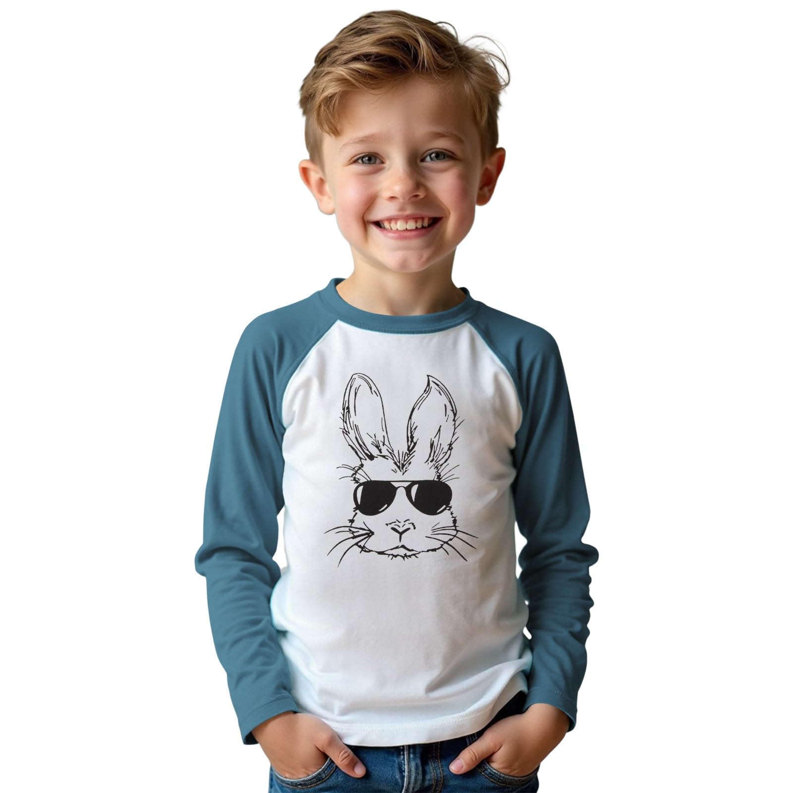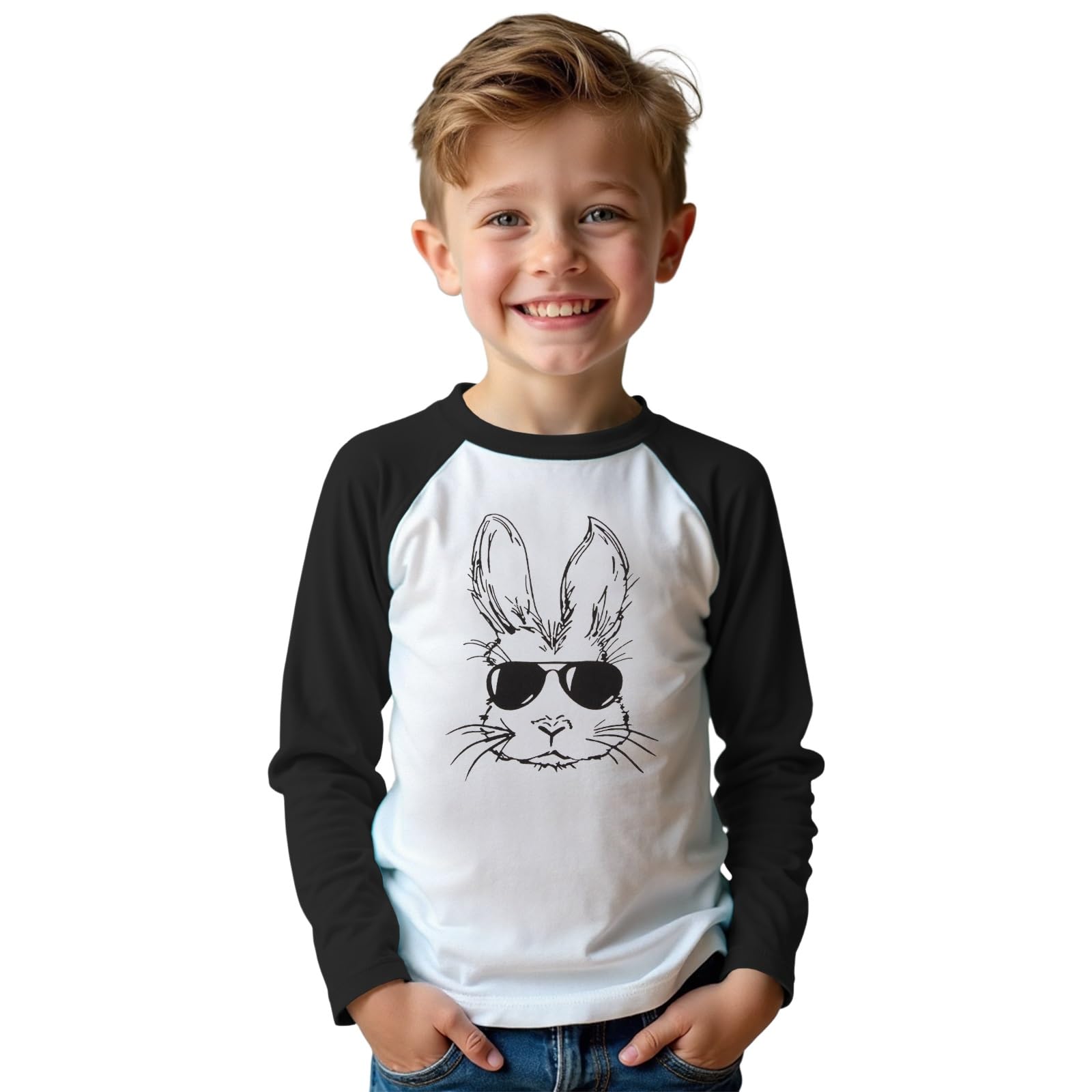 Kids Boy Easter Bunny Shirts Rabbit Face with Sunglasses Long Sleeve Raglan T-Shirt Happy Easter Tops 7-12 Years