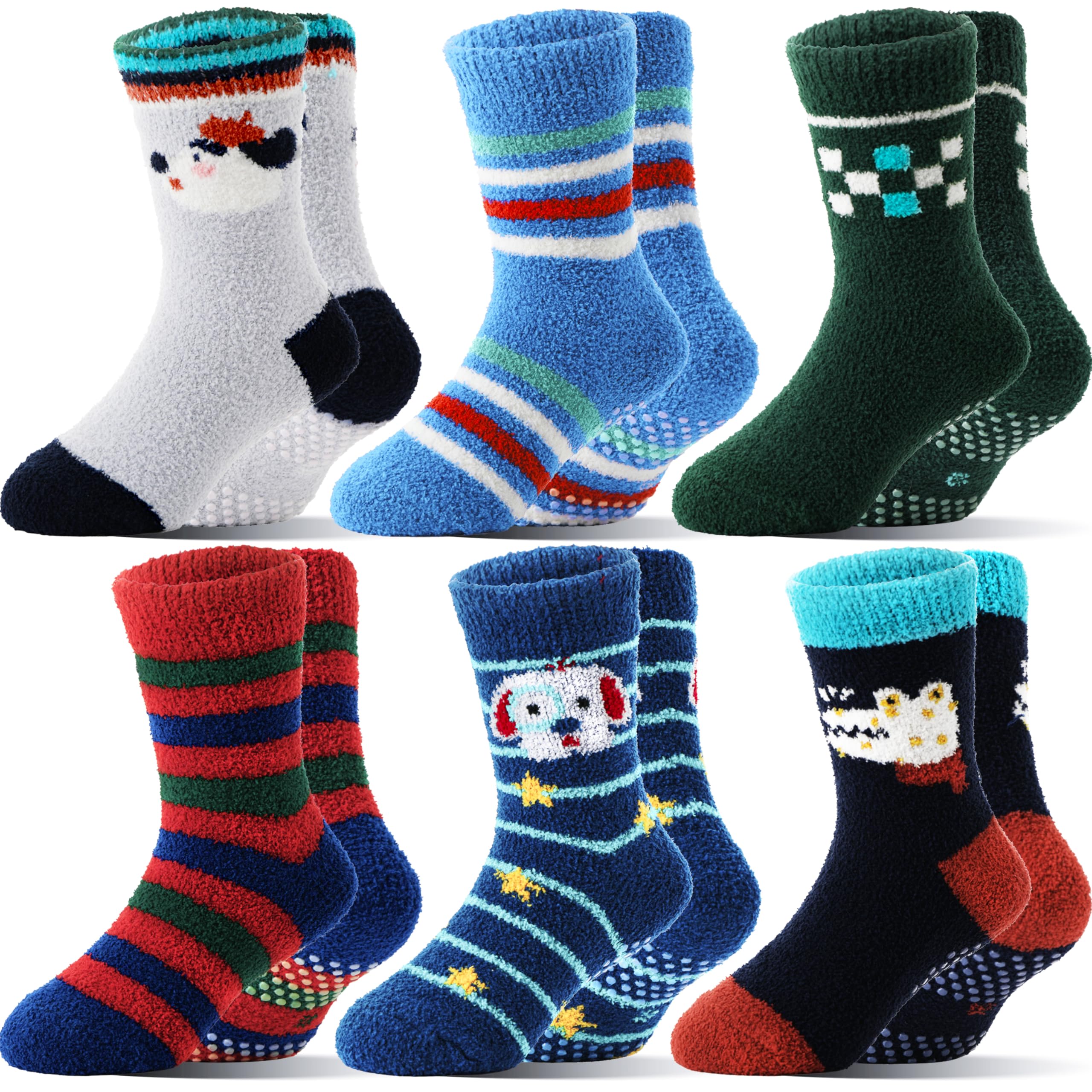 Boys Kids Toddlers Fuzzy Grips Socks Non Slip Cozy Fluffy Warm Winter Crew Cabin Fun Slipper Socks 6 Pairs