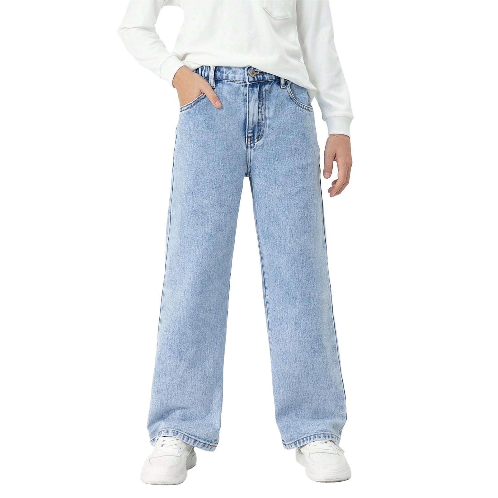 Boys Slim Fit Stretch Jeans, Elastic Waist Denim Pants for Big Kids Size 8-12, Soft School Blue Trousers, Acid Wash