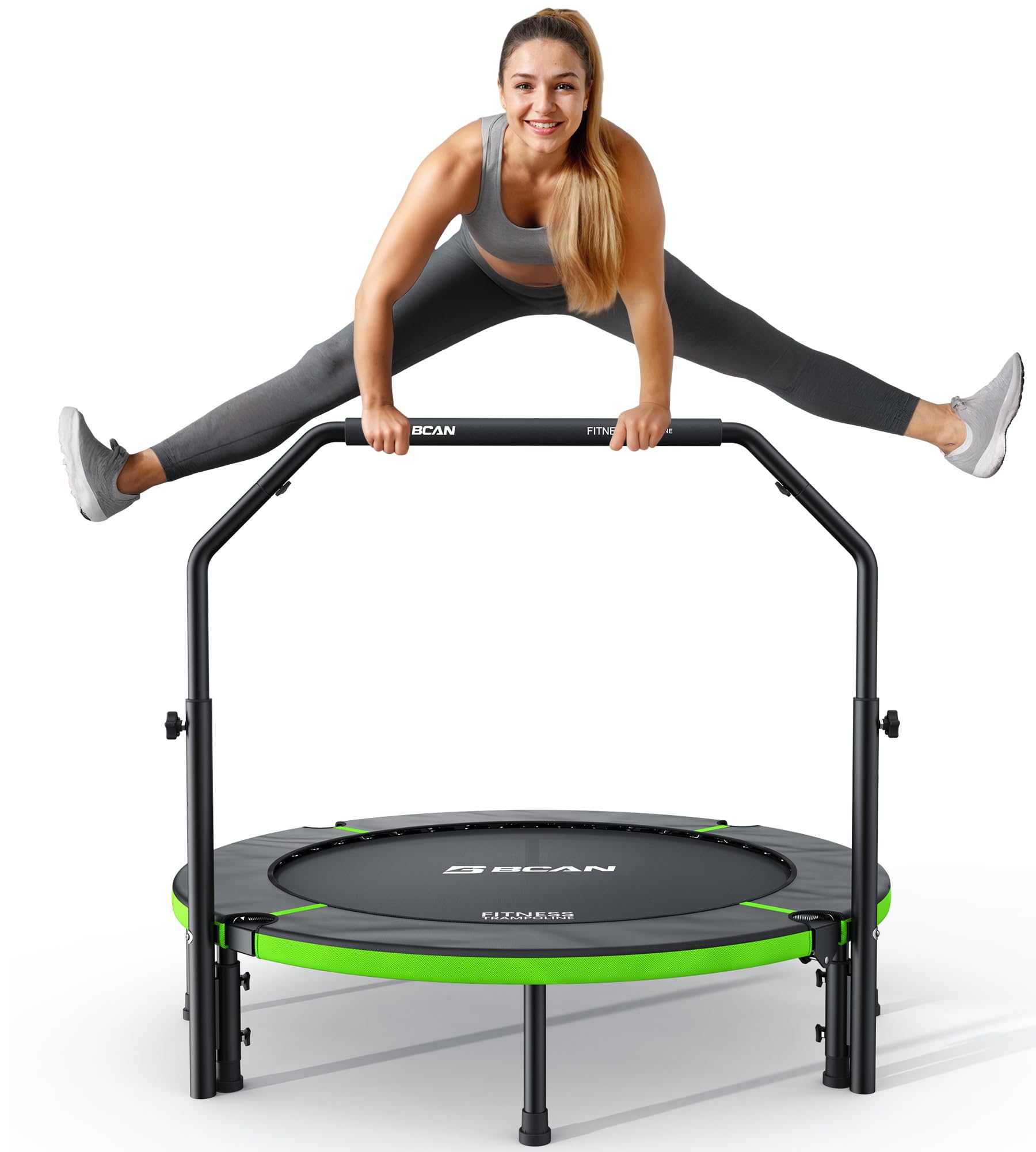 Ultra-Stable System: Equipped with 2026 upgraded triple reinforced stability system and heavy-duty construction, Our mini trampoline let you say goodbye to the troubles of tipping over and wobbly handle 330 Lbs High Capacity: 32 high-strength springs, thickened alloy steel, tear-resistant mat make our exercise trampoline supports up to 330 lbs, allowing everyone to join in the fun and fitness journey 3-Level Adjustable Handle: Handle height available from 32'' to 42''. BCAN Rebounder Trampoline for Adults can be adjusted to the height range, ensuring that you can hold the handlebar in the most comfortable position when jumping Quick Assembly: Our fitness trampoline comes with 80% pre-assembled and step-by-step installation video. Only 10 mins to set up your workout partner 10 Mins Burn 250 calories: Just 10 mins of trampoline indoor exercise, you can achieve full-body fat burning. Effortlessly maintain your daily fitness routine, making location no longer a barrier Worry-free Service Support: Quick response within 24 hours. BCAN parts warehouses are located throughout the US. Make after-sales service easier and efficient