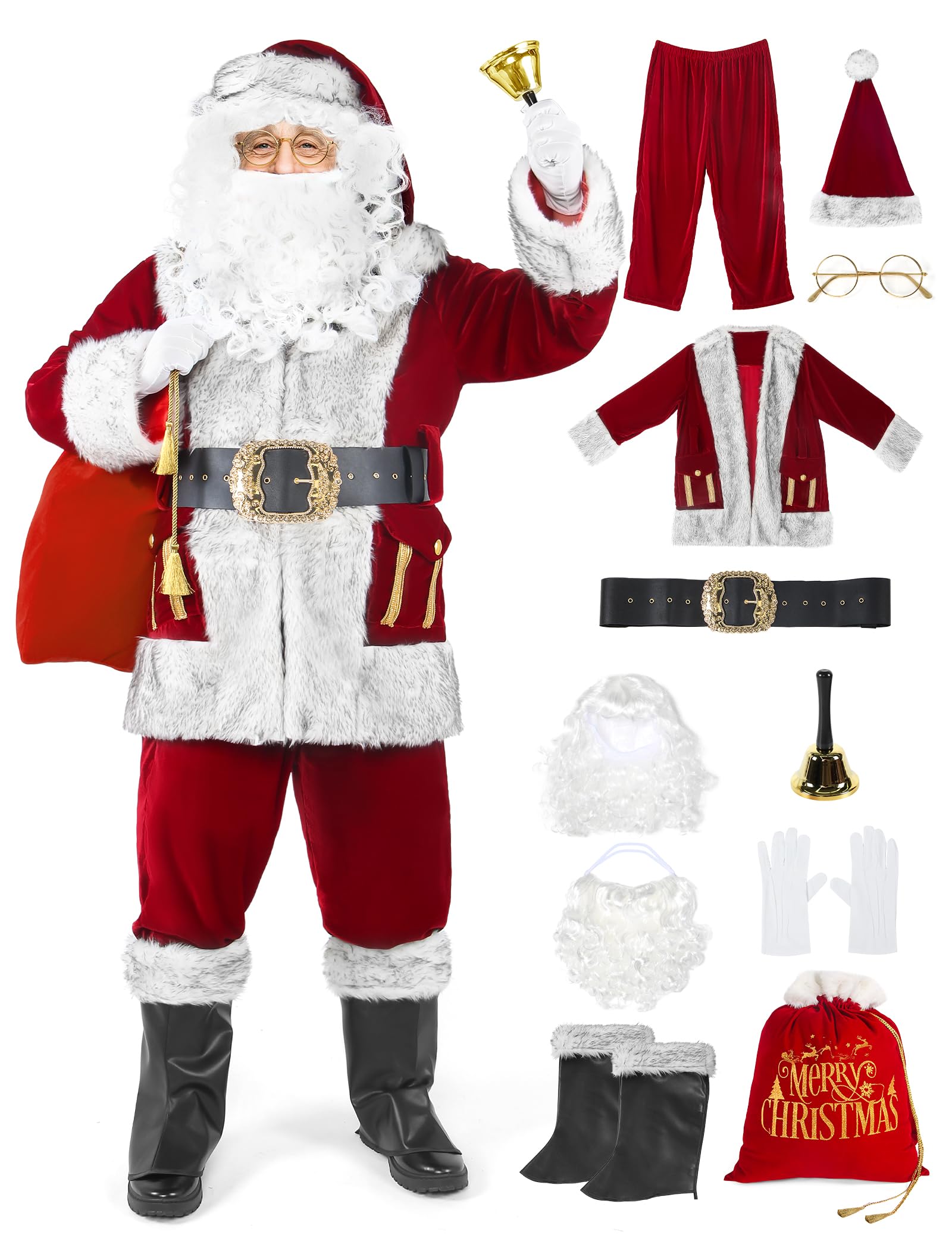 Santa Claus Costume for Adults 11PCS Deluxe Santa Suit Christmas Outfit Men Professional Plus Size Xmas Cosplay Party