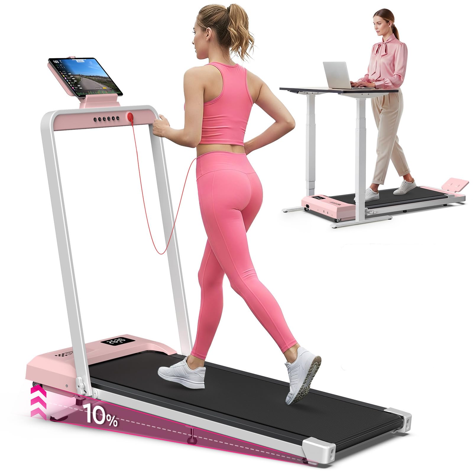 【Walking Pad with 10% Incline】This walking pad with handle bar offers a 10% manual incline for a realistic mountain-climbing experience. Training on an incline helps you burn more calories, activates more muscle groups, and boosts cardiovascular health. Perfect for home fitness, it makes your cardio and strength training more efficient in the same workout time. 【2 In 1 Foldable Treadmill】The upgraded treadmill offers two modes to fit your lifestyle: Running Mode (0.6–6.2 MPH) for an intense workout, and Walking Mode (0.6–3.8 MPH) for light exercise while working. The portable treadmill is perfect for use under your desk, while the remote control with one-touch mute makes speed adjustments effortless. A built-in phone/tablet holder lets you watch movies or join work calls as you walk, keeping workouts productive and enjoyable. 【3.0HP Powerful & Quiet Motor】Equipped with an upgraded 3.0HP motor, this walking pad treadmill delivers stable performance and supports users up to 320 lbs. It operates quietly under 45 dB, creating a peaceful workout environment without disturbing others, perfect for both home and office use. 【Shock Absorption & Wide Running Belt】This walking treadmill features a spacious 36" × 16" running belt for comfort and safety. Equipped with a 7-layer anti-slip belt and 8 silicone shock absorbers, it provides a smoother workout and reduces impact on your joints—helping protect your knees during every step. 【LED Display & Smart App】The incline walking pad features an intuitive LED display that shows real-time stats including time, distance, speed, and calories, so you can track progress at a glance. The treadmill is also compatible with popular fitness apps, letting you personalize workouts and stay motivated—no subscription required. 【Designed for Space-Saving】No assembly required—this portable treadmill is ready to use right out of the box. Its slim, sturdy design and smooth-rolling wheels make it easy to move and store under sofas, desks, or beds (just 4.4" tall when folded). You can also place it against a wall, making it perfect for small apartments, dorm rooms, or any tight space. 【Exceptional Customer Service】We're dedicated to providing good walking pad treadmills and excellent after-sales service. Any questions, please reach out to us and we're happy to help!