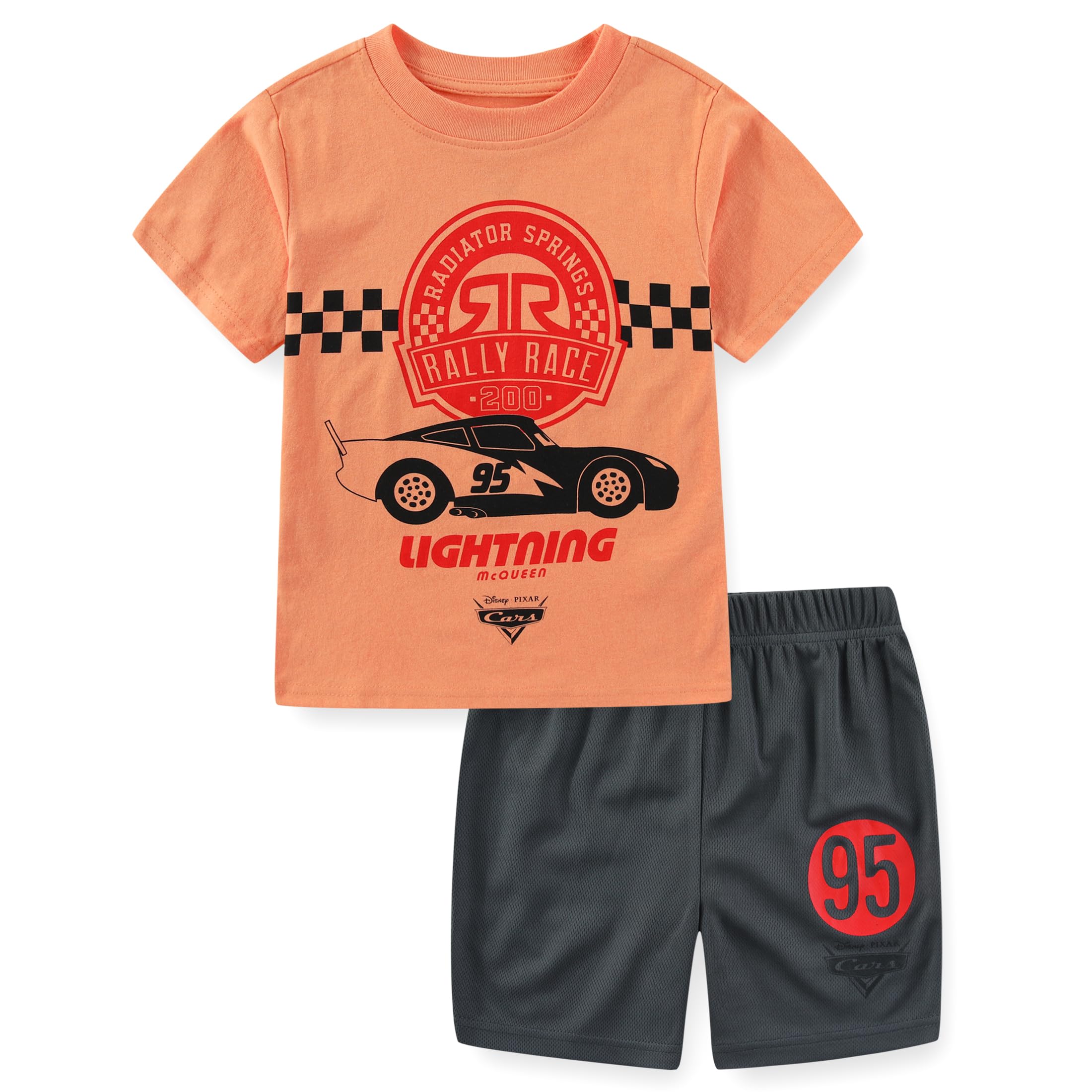 Officially Licensed Disney Pixar Cars Lightning McQueen Boys Short Sleeve T-Shirt and Mesh Short Set, a must have 2-piece outfit for toddlers and big kids who love high speed adventures with Lightning McQueen racing world. Rev up your little racers style with this orange short sleeve t-shirt with a Lightning McQueen race graphic, paired with matching black mesh shorts with 95 print that bring high speed racetrack excitement to everyday adventures. Designed for little to big boys, it is available in toddler boys clothes sizes 2T and 3T and big kids boys clothes sizes 4, 5, 6, and 7, this Cars shorts set grows with your child and delivers long lasting wear. Made from soft, breathable, and durable fabric that keeps your little hero cool and comfy all day long. Easy to clean and machine washable, making it a practical favorite for playdates, school days, birthday parties, and everyday wear. Great Cars birthday present for your son, grandson, and nephew. Complete the look by pairing this with Cars shoes, Lightning McQueen socks, Cars hoodie, Lightning McQueen backpacks, or Cars accessories to create a complete Cars outfit.